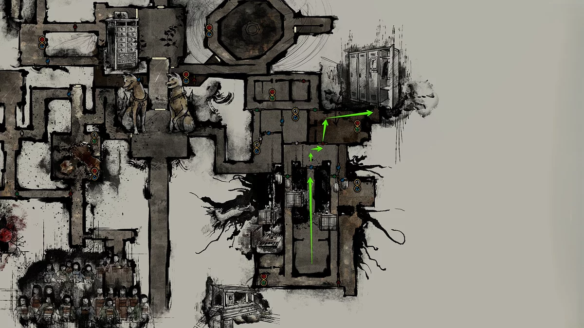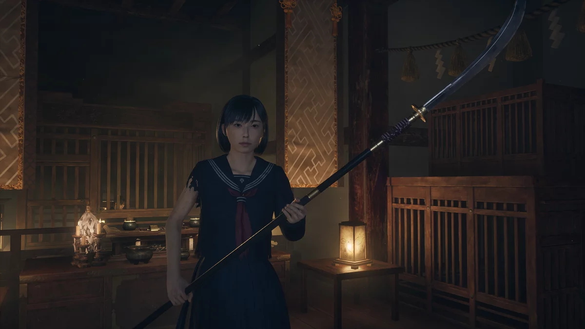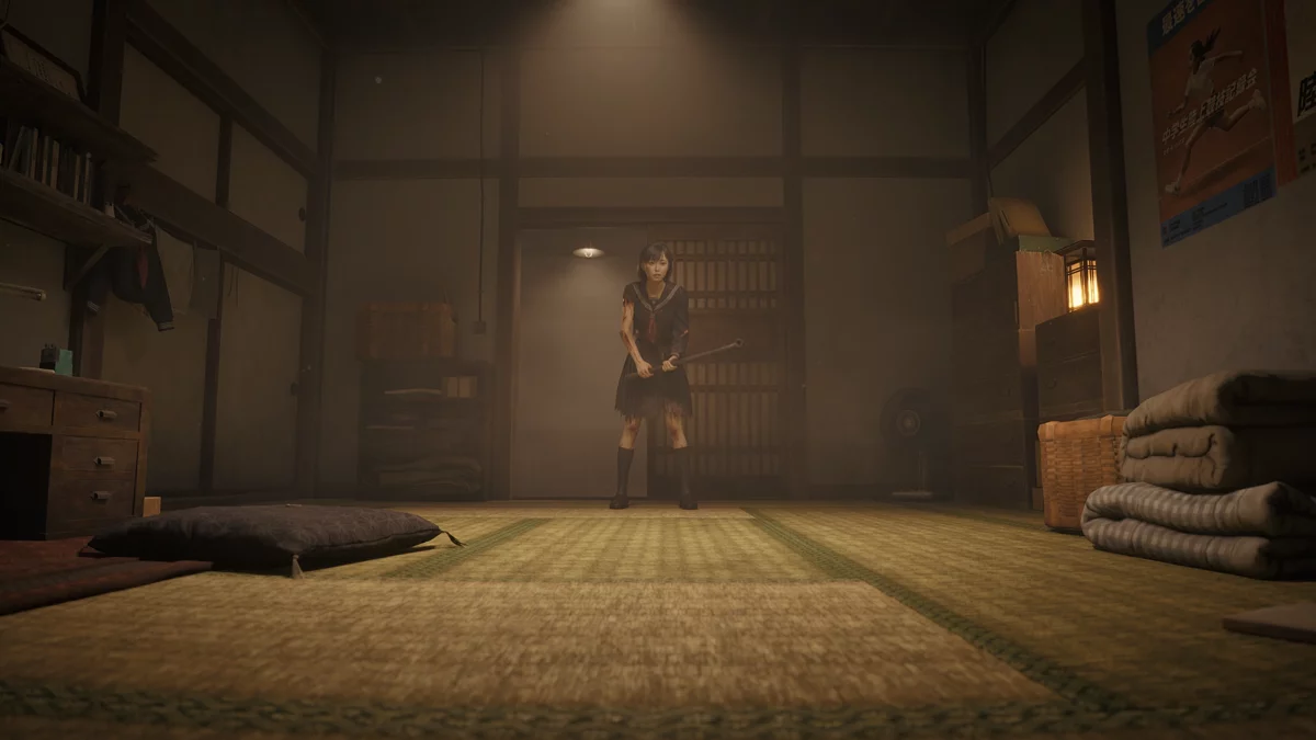 Войдите в зал поклонения Сакуко и решите головоломку «Освещение». Покиньте помещение с пазлом, после чего все двери в локации откроются. Вернитесь в раздевалки и зайдите в комнату слева. Поверните налево и посмотрите на тумбочку.