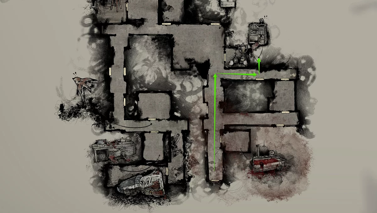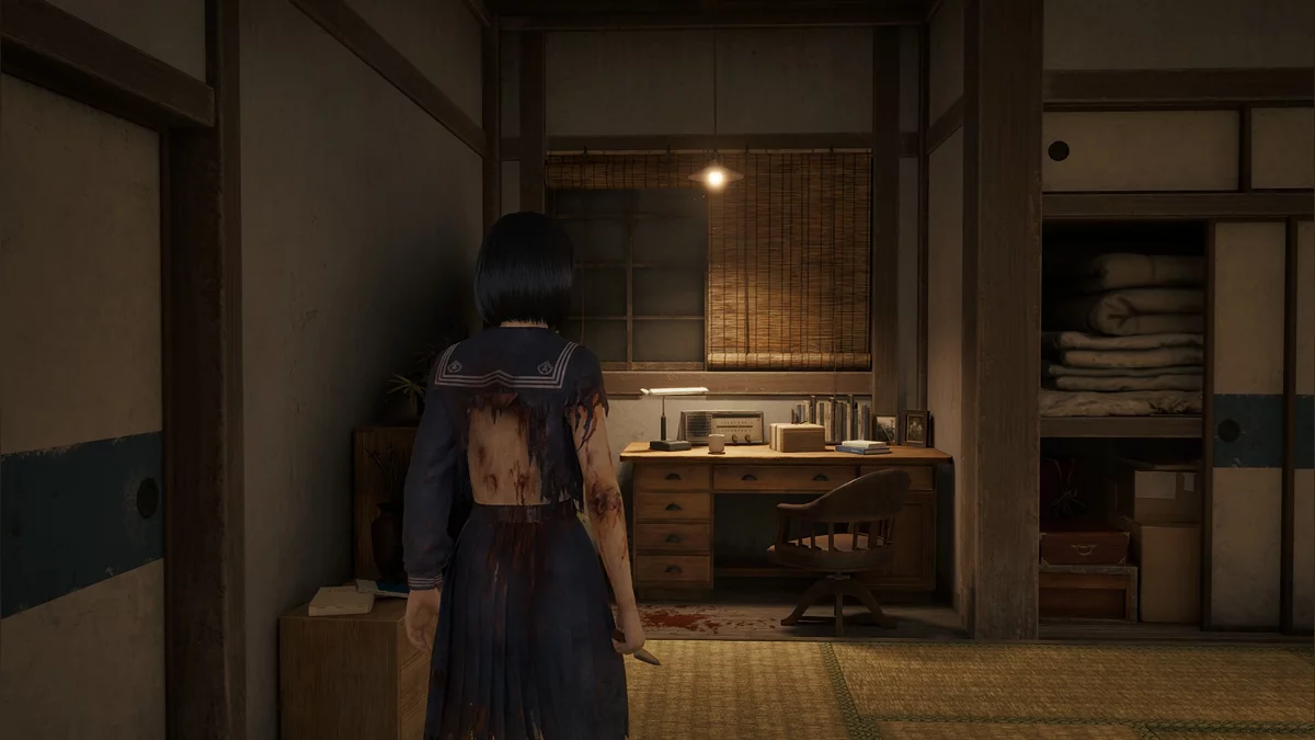 Попадите в финальную локацию «Дом семьи Симидзу» и получите все пластины. Зайдите на третий уровень, двигайтесь вперёд и на втором повороте уйдите направо. Следуйте до первой двери справа и сверните налево. В результате попадёте в потайной коридор, не отмеченный на карте. Дойдите до конца, войдите в окровавленную комнату Хинако и обратите внимание на письменный стол.