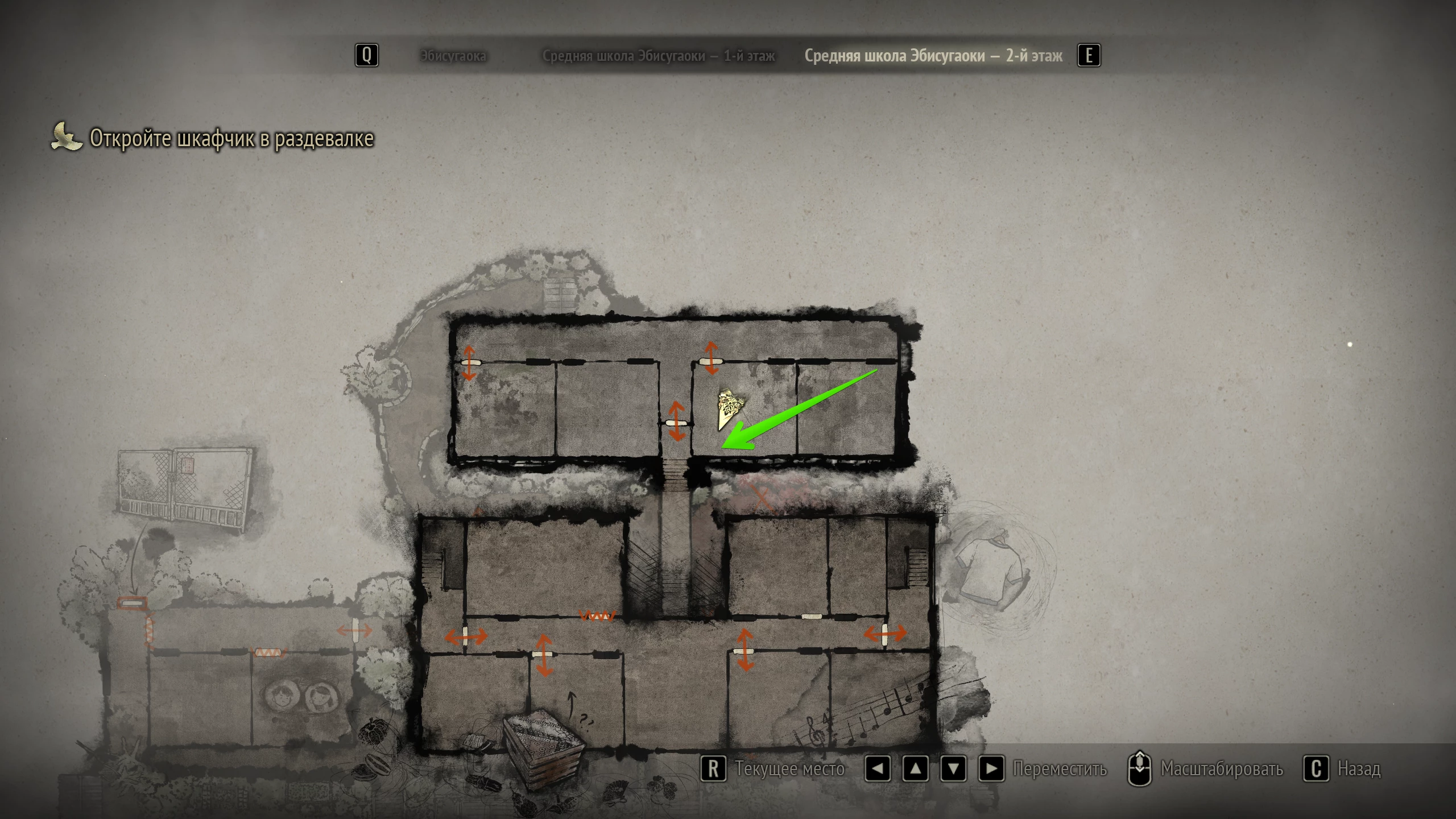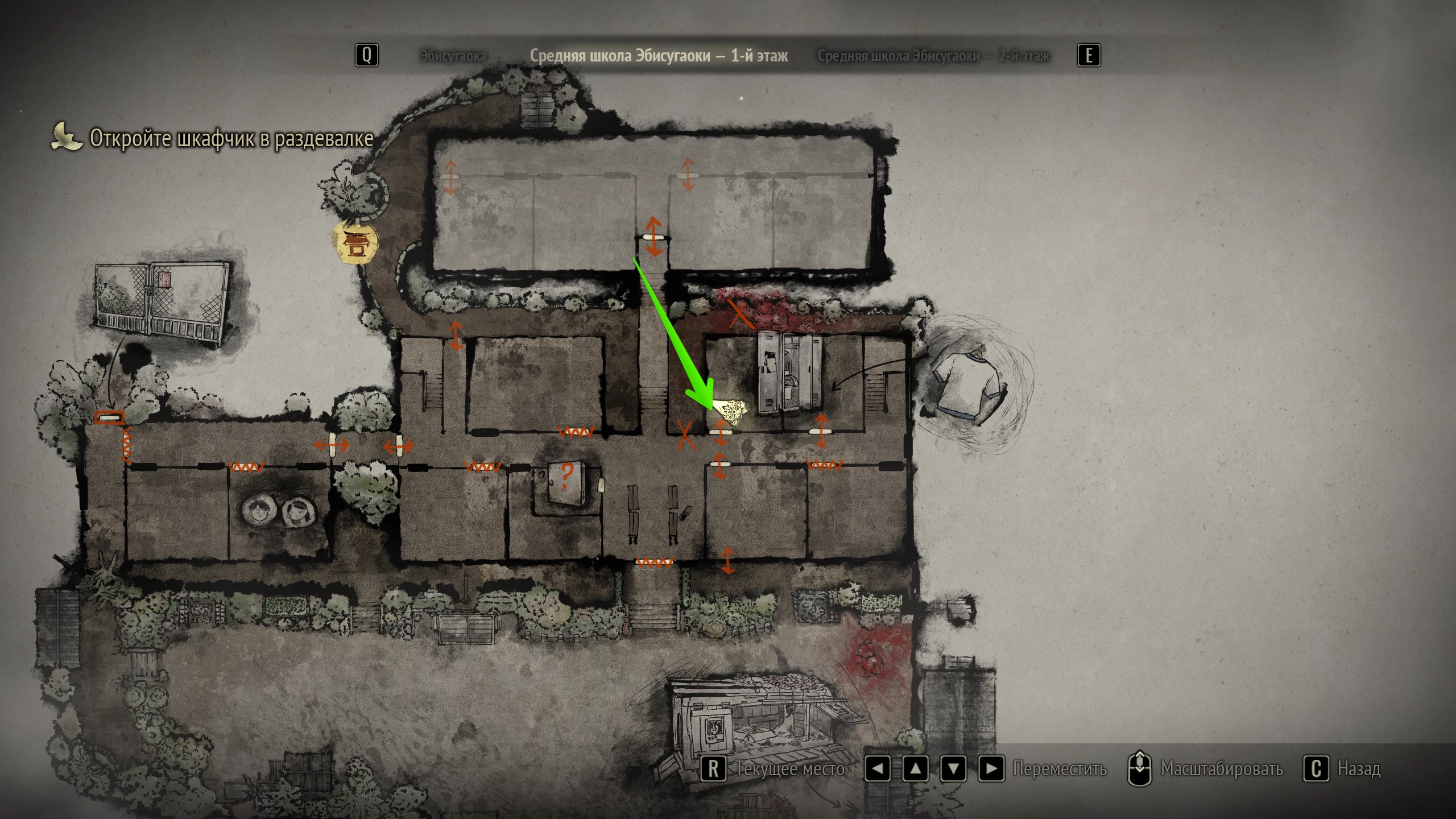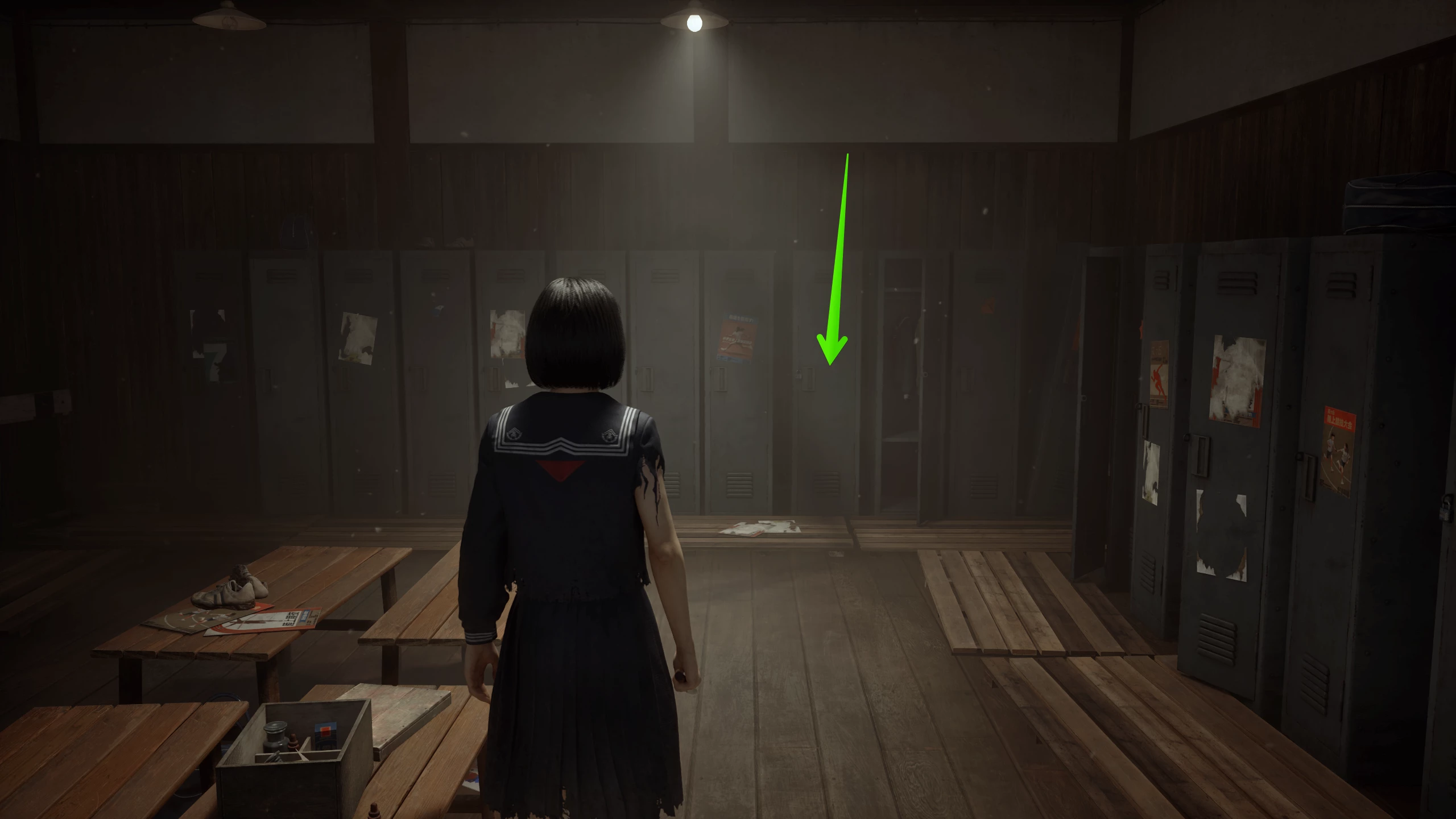 Шкафчики учеников находятся на первом этаже средней школы Эбисугаоки, рядом с обувными стойками у кабинета дежурного учителя. Чтобы туда попасть, нужно войти на второй этаж и открыть деревянный ящик в классе Хинако. Затем в соседней аудитории необходимо отыскать ключ от пристройки, в которой лежит связка от женской раздевалки.