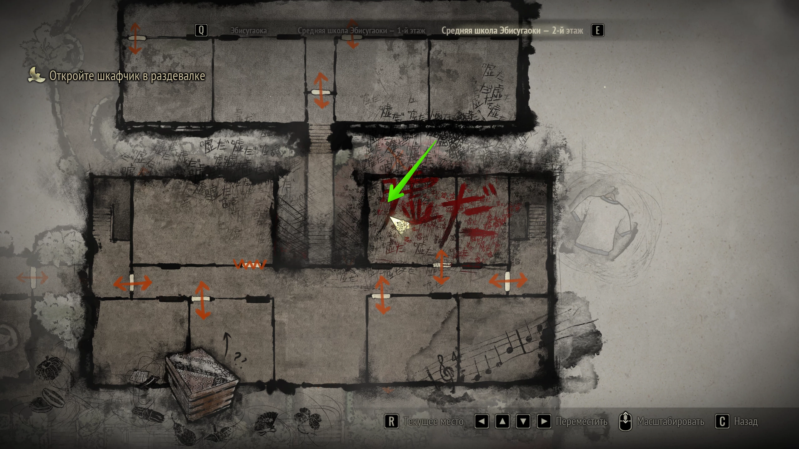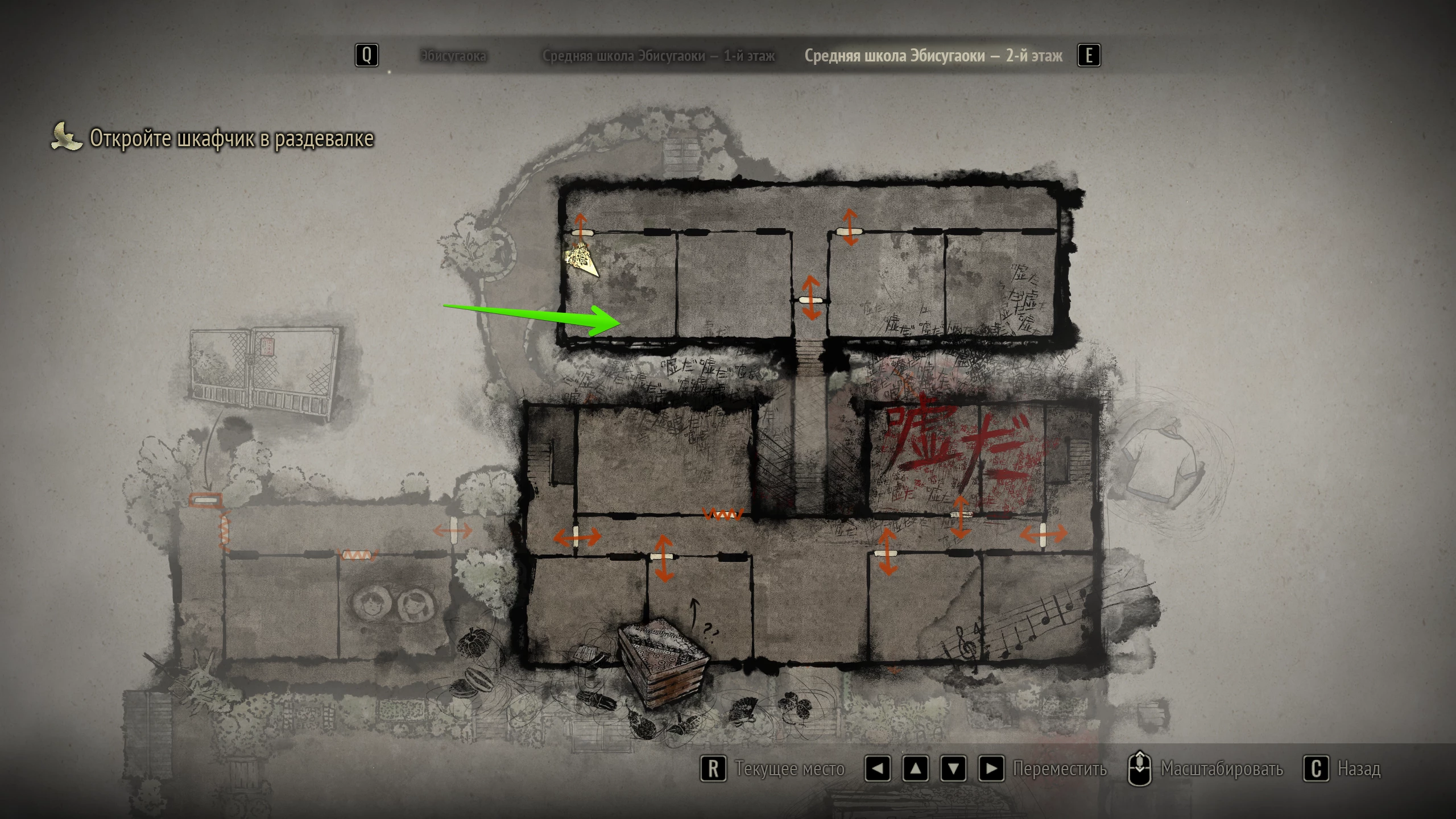 Чтобы отыскать подсказку, отправляйтесь в левую аудиторию в школьной пристройке. Осмотрите за партами стеллаж и возьмите из правой верхней ячейки записку.