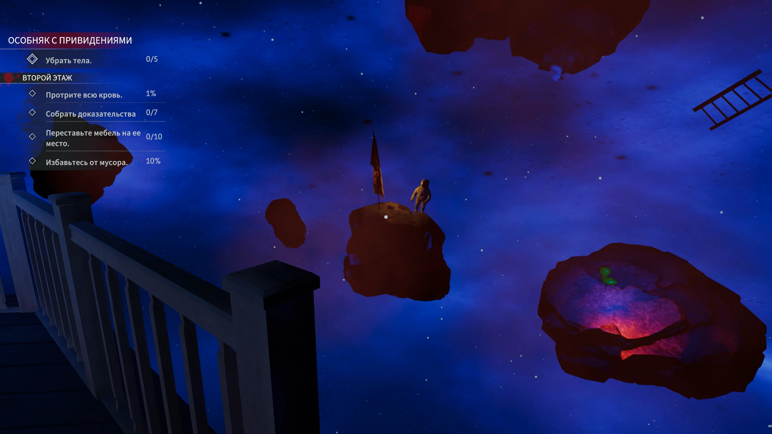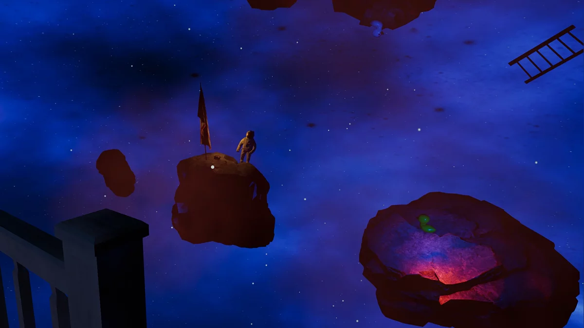 Поднимайтесь на второй этаж и заходите в комнату напротив кривой картины. Подойдите к окну и откройте его, чтобы выбраться наружу. Снаружи будет космос с астероидами. Найдите камень с космонавтом и флагом — возле него находится шкатулка. На обратном пути можете открыть окна первого этажа.
