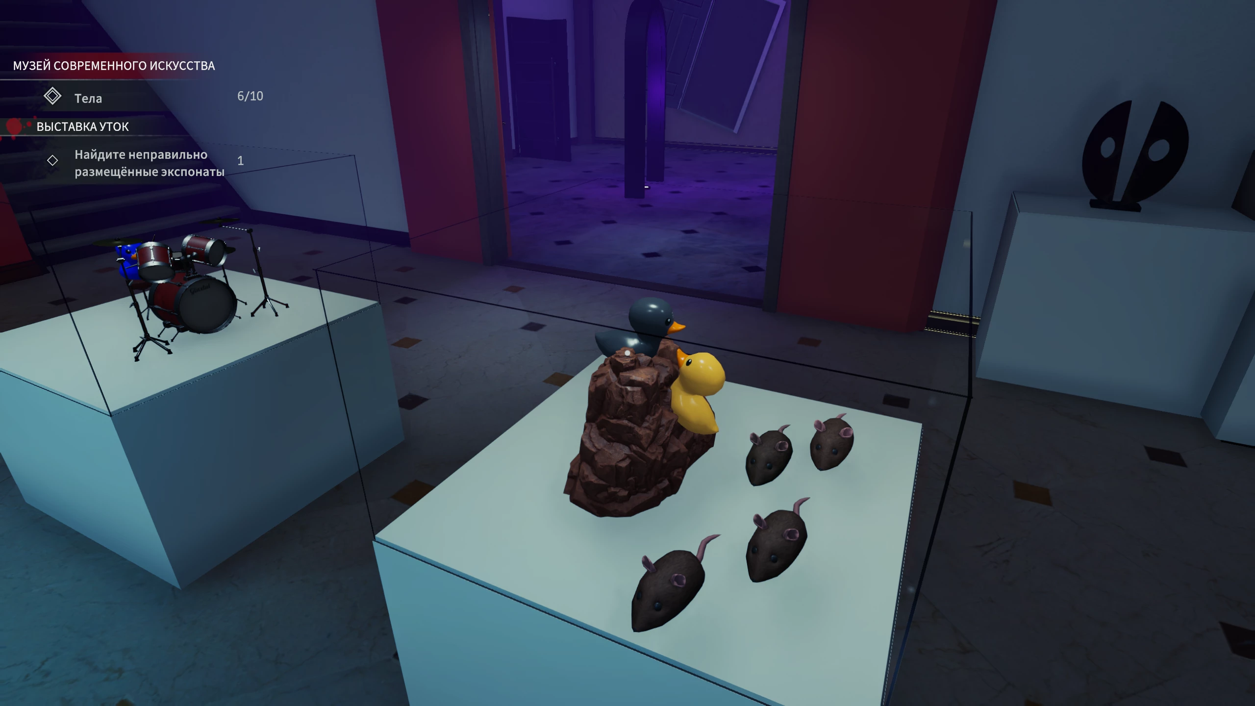 Зайдя в кафетерий, развернитесь и осмотрите пол. Там будет лежать улика «Игрушечный пистолет». Пройдите ещё чуть дальше, слева на стене расположен Ловец снов № 2. В следующей комнате с красным порталом возле трупов лежит улика «Кинжал». Не стоит нажимать на красную утку, потому что будет бесконечно появляться новый мусор.