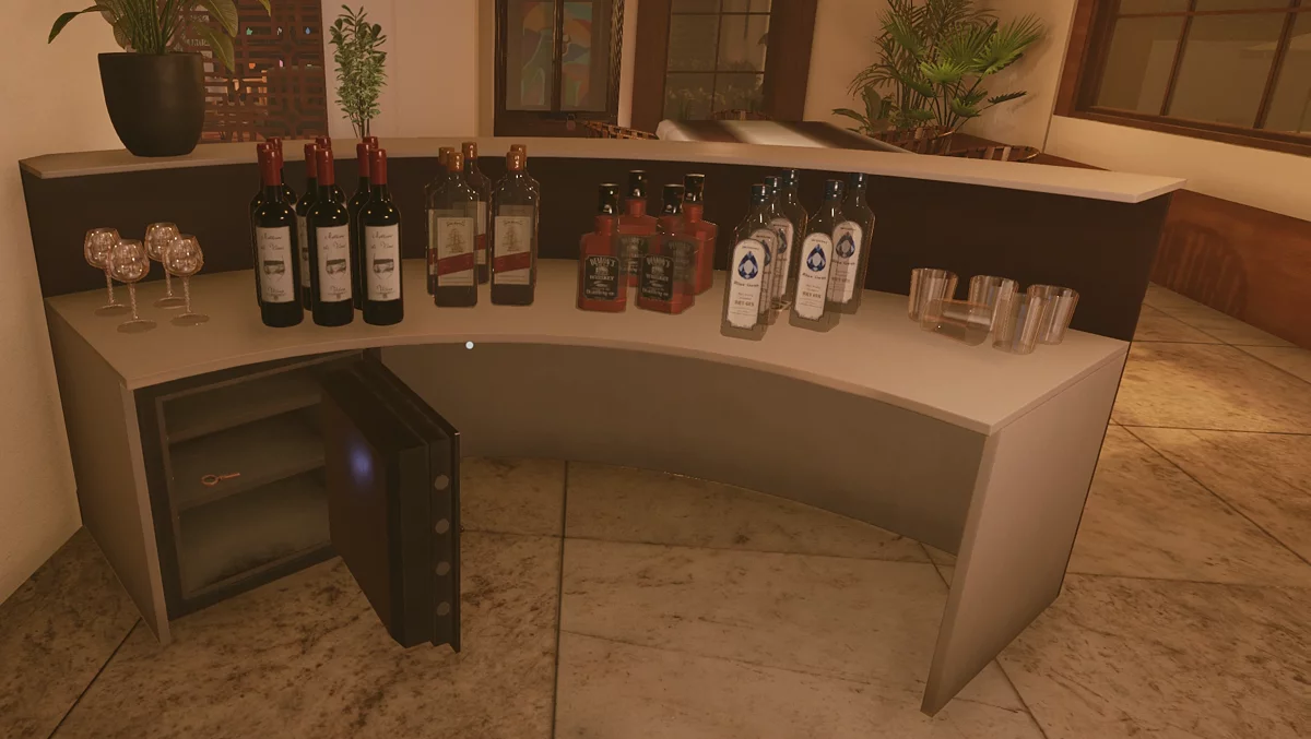 Вы попадёте на кухню. В центре круглого стола можно подобрать ключ от головоломки 04, который открывает срезку к другим частям квартиры. За барной стойкой находится сейф, код к которому можно увидеть, оценив бутылки на столе. Ответ «9-5-4-6». В сейфе будет ключ от головоломки 05, который открывает шкаф с картиной.