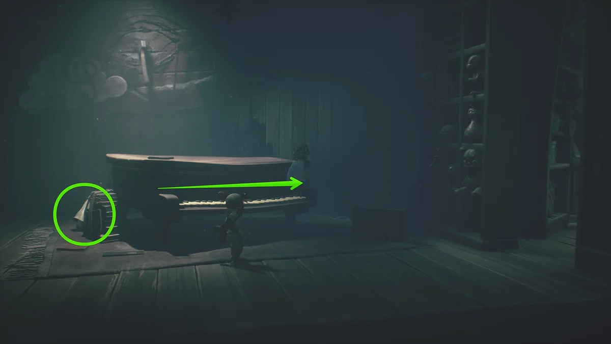 Вернитесь в коридор, следуйте до конца и войдите в крайнюю комнату справа. Вы увидите рояль. Забирайтесь прямо на клавиши и нажмите на все ноты: от самой низкой до самой высокой. В результате шкаф справа откроется, и оттуда выбежит ном, который спрячется у стопки книг.