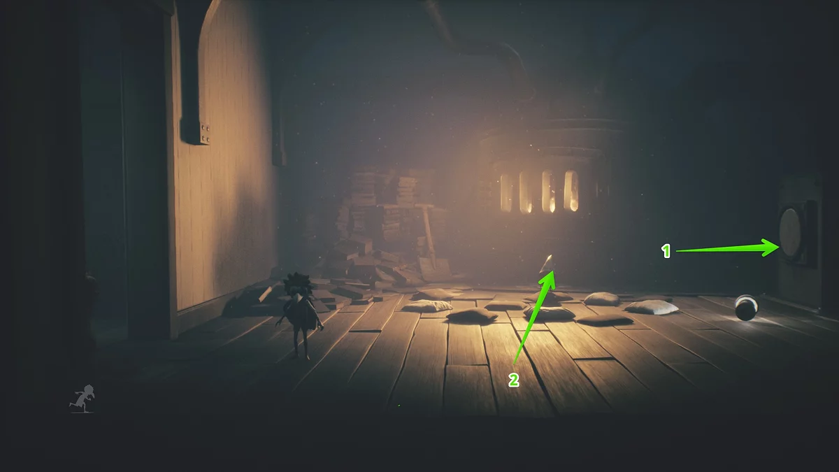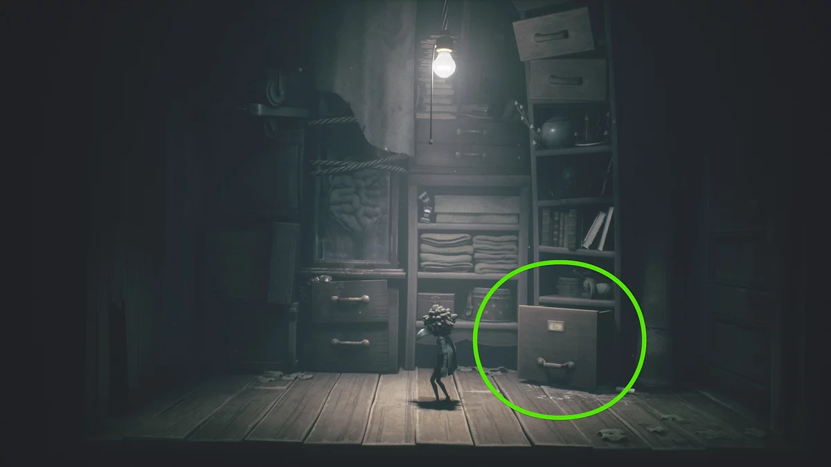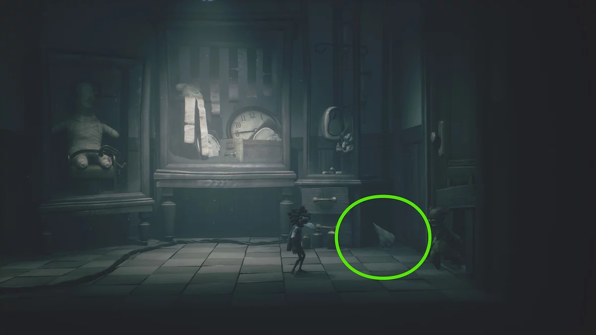 Покиньте зал с планетарной головоломкой и заберитесь на верхний уровень локации с подвесной ванной. Пойдите в комнату справа, где вы найдете третью куклу. Чтобы спугнуть нома, подвиньте на себя нижний ящик.