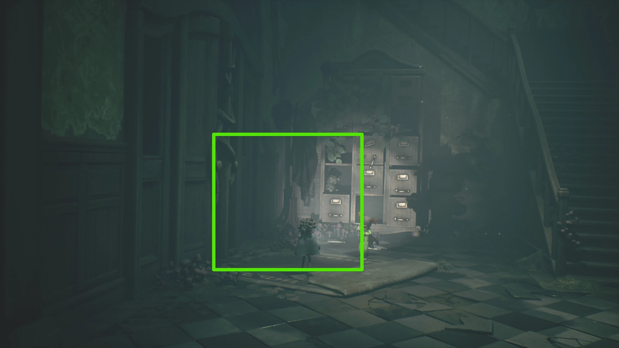 Переживите первую встречу с гигантской рукой. Пройдите через грибное поле и окажетесь перед лестницей, ведущей наверх. Отыщите силуэт в левом углу рядом с вешалкой.