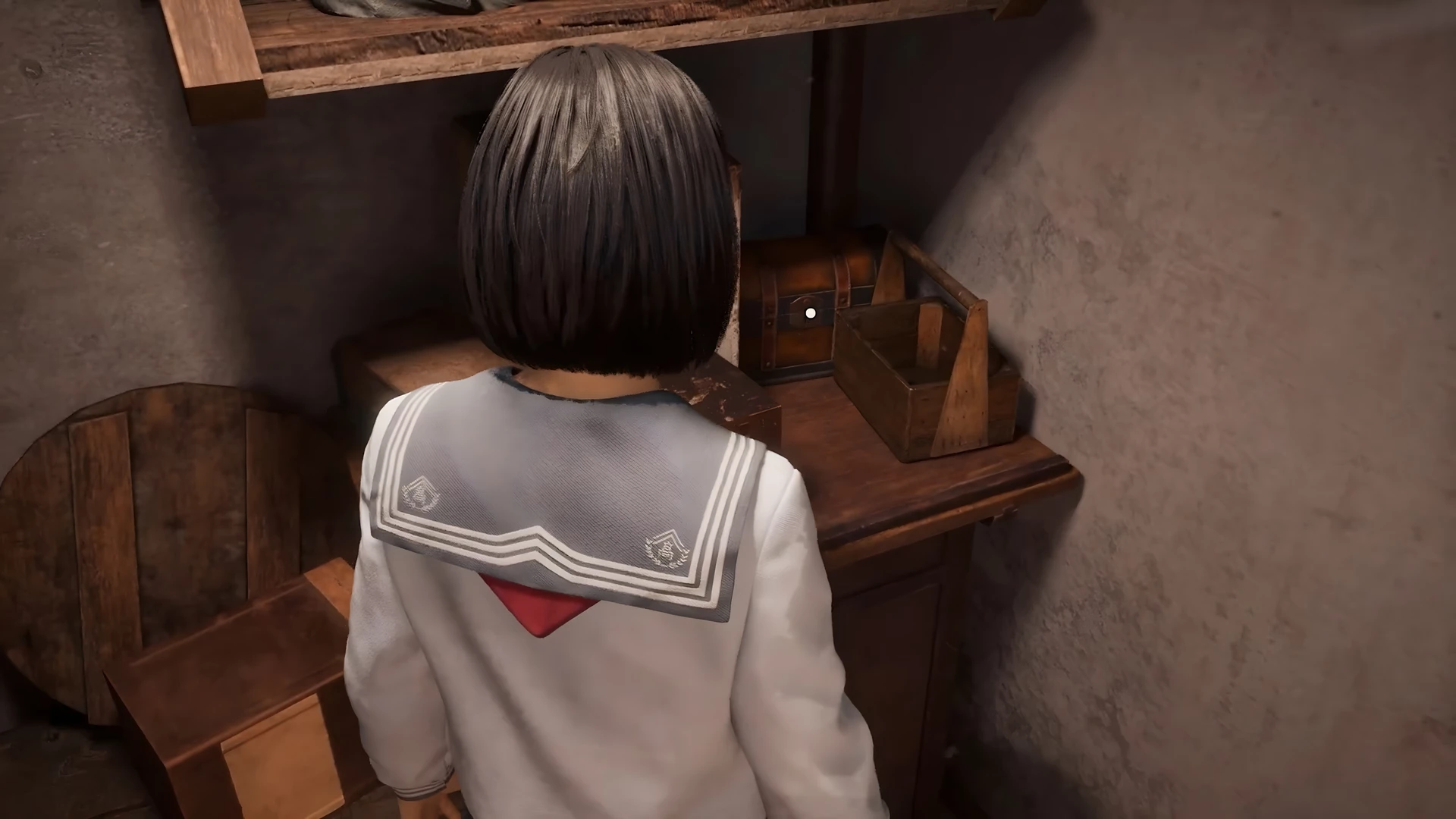 Спускайтесь на первый этаж. Пройдите через обеденную на кухню и откройте ширму в кладовку слева. Подойдите к тумбочке в левом углу и откройте маленький сундучок.