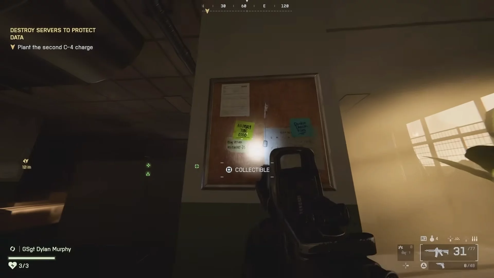 10 — Первый жетон находится довольно далеко от начала миссии. Когда вы подниметесь на первый этаж горящего посольства, Картер (Carter) прикажет вам выломать дверь. Вместо того чтобы выполнять приказ сразу, поверните налево и идите до конца коридора. Зайдите в кабинет справа, затем пройдите в ванную комнату в дальнем углу. Жетон висит на рамке рядом с унитазом.