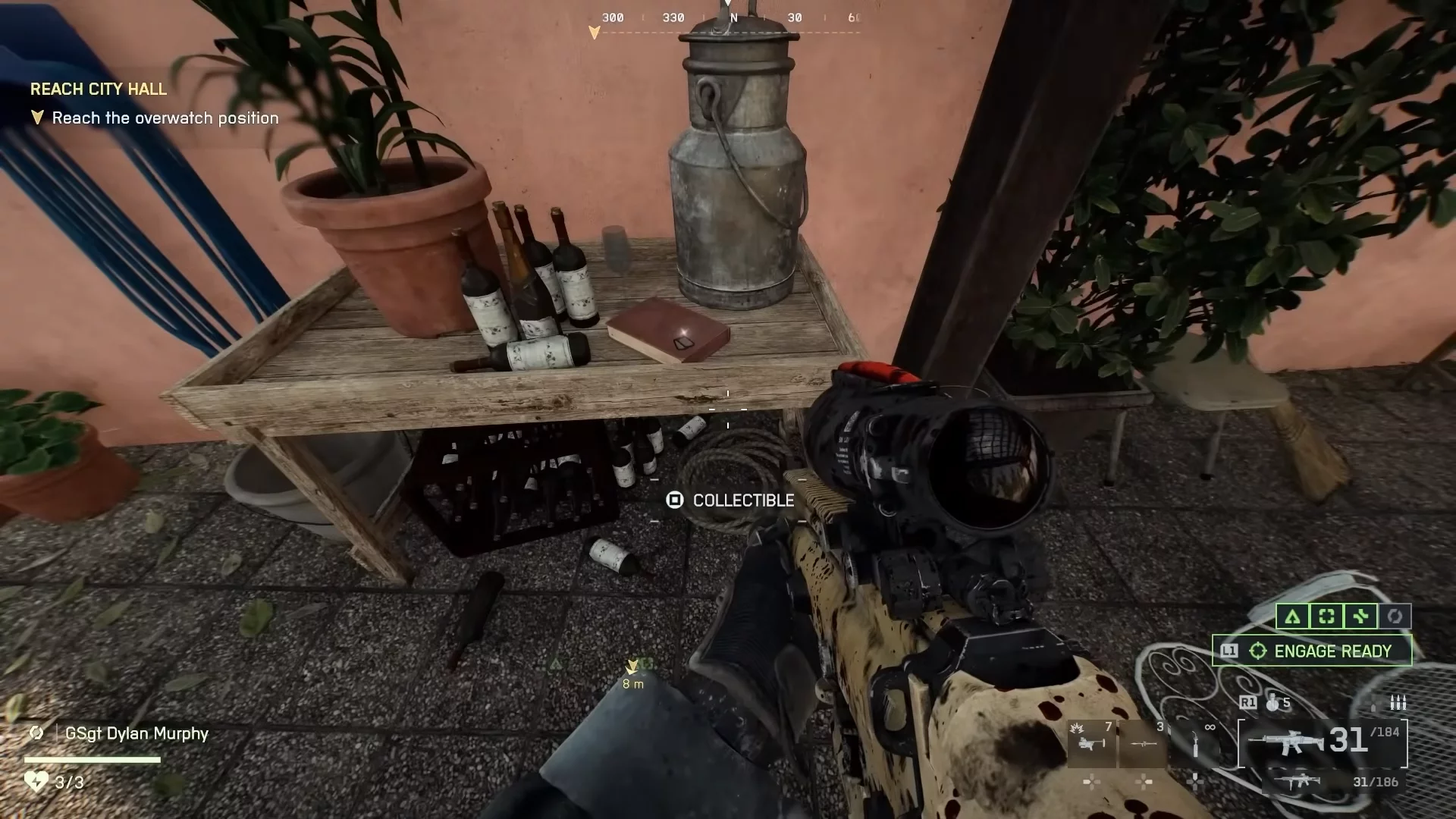 7 — Рядом с местом, где вы впервые покидаете танк и выходите на парковку, направляйтесь к дальнему концу площадки, где ранее располагались огневые точки. Поднимитесь по лестнице слева, затем поверните направо, чтобы выйти на каменную террасу. Оказавшись наверху, посмотрите направо и немного назад — жетон находится на столе рядом с рацией. Когда вы приблизитесь, Кинкейд (Kincaid) заговорит по ней с солдатами.