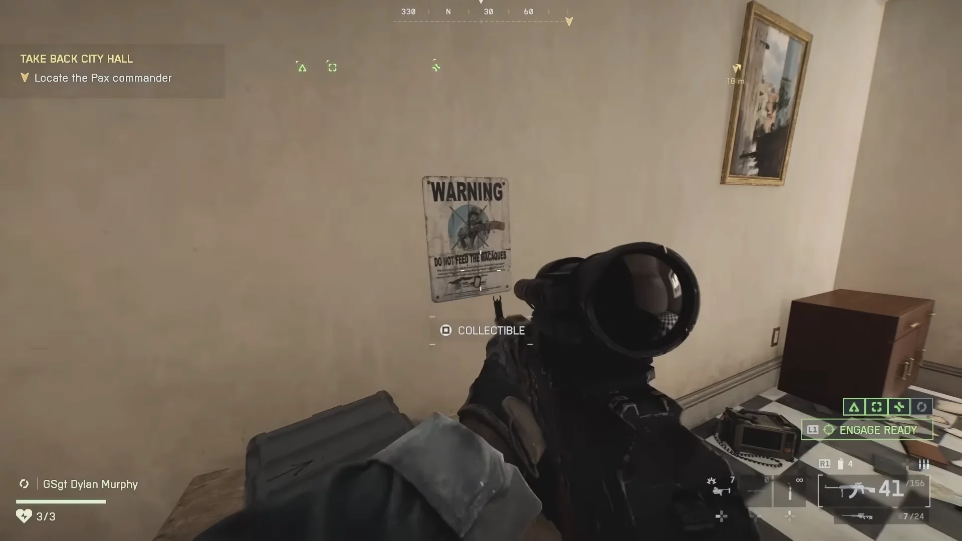 9 — В финале миссии, когда доберётесь до мэрии, войдите через главный вход и поверните налево. В небольшой комнате вы увидите плакат с надписью «Не кормить макак» — в него воткнут нож, на котором висит солдатский жетон.