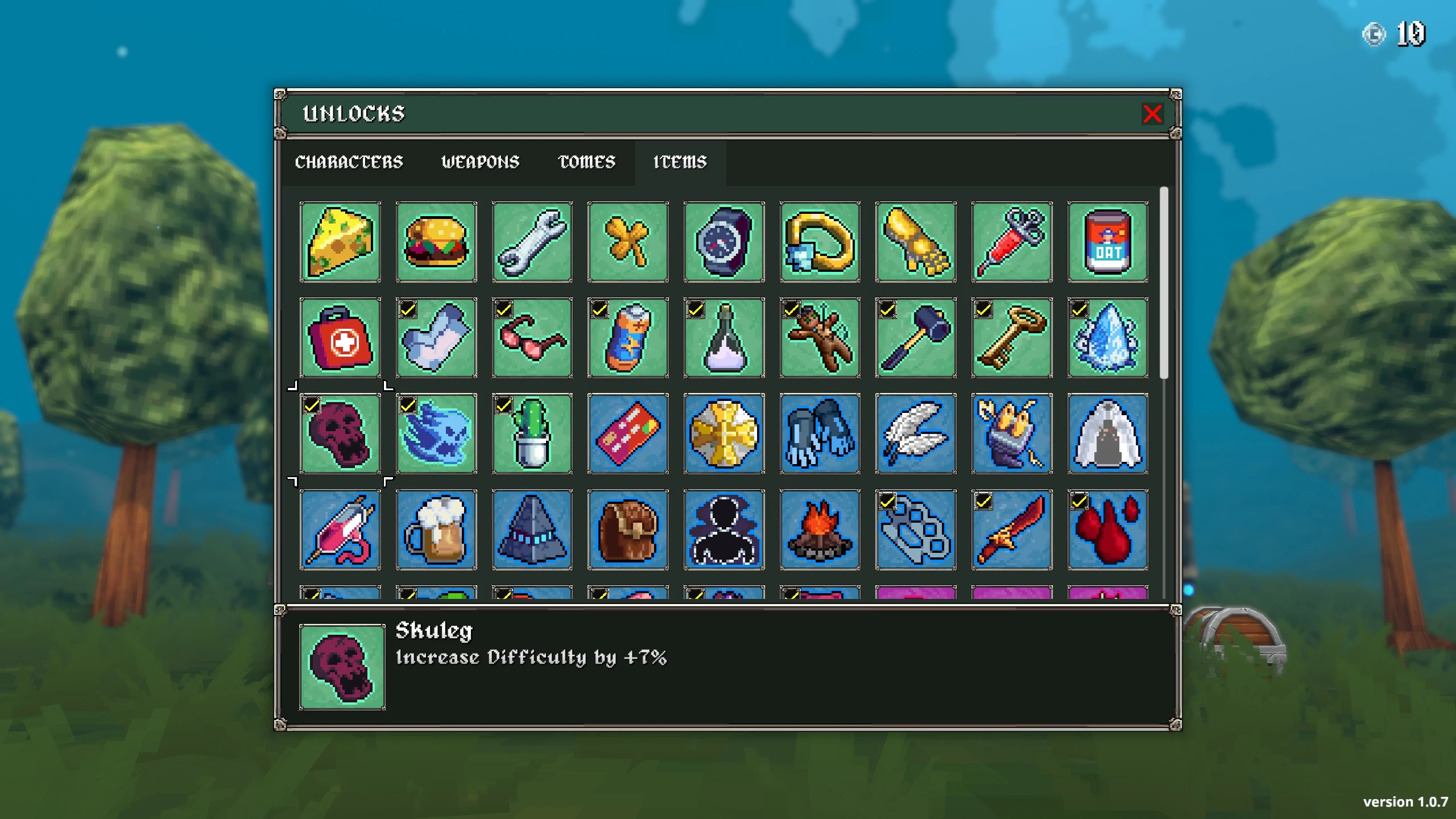 Предметы (Items) — особые перки, которые влияют на характеристики героя или его оружие, а некоторые из них обладают особенным эффектом. Например, святая книга (Holy Book): +100 очков максимального здоровья и +50 к регенерации жизни. Всего их в игре 78 штук, и почти половина шмоток доступна с начала игры. Как открыть все предметы, мы описали в другой статье.