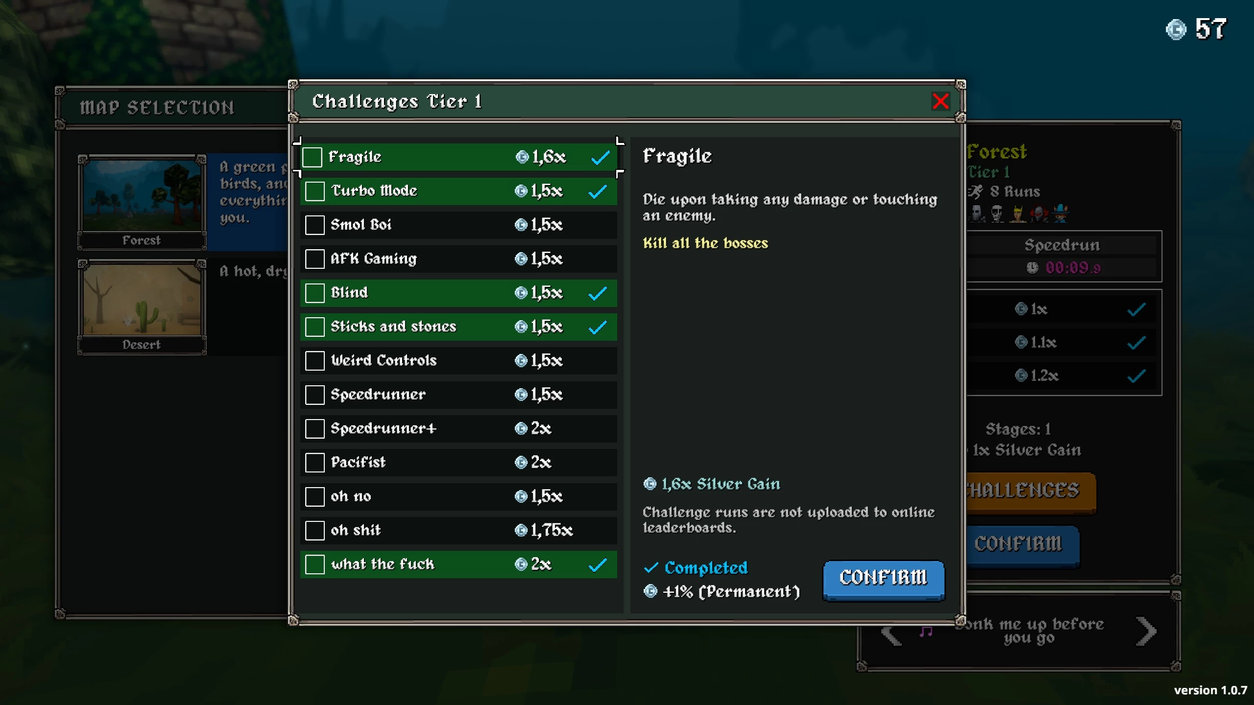 При запуске игры с испытанием активируется модификатор, влияющий на добычу серебра. Успешное прохождение челленджа даёт постоянную прибавку к валюте для всех последующих забегов.