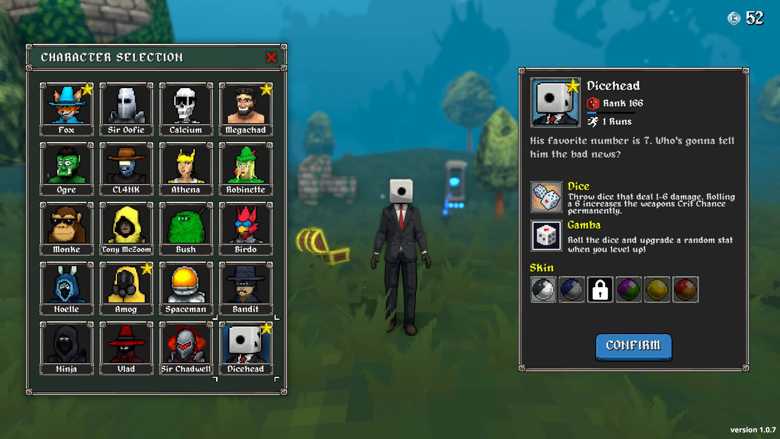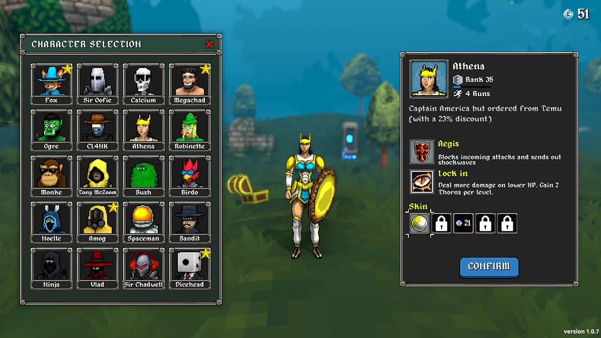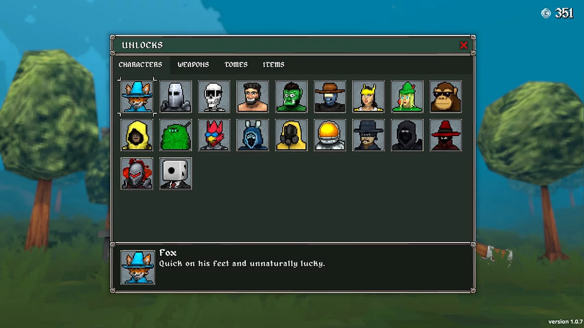 Персонаж (Character) — герой, вокруг которого строится билд с помощью его уникальной способности, оружия, фолиантов и предметов. Всего в игре 20 юнитов. Чтобы получить всех персонажей, нужно открыть все локации и выполнить ряд особых условий. Как правило, это получить оружие и завершить специальное задание. Например, для разблокировки Афины необходимо раздобыть щит «Эгида», а затем во время забега прокачать том «Шипы» до девятого уровня.