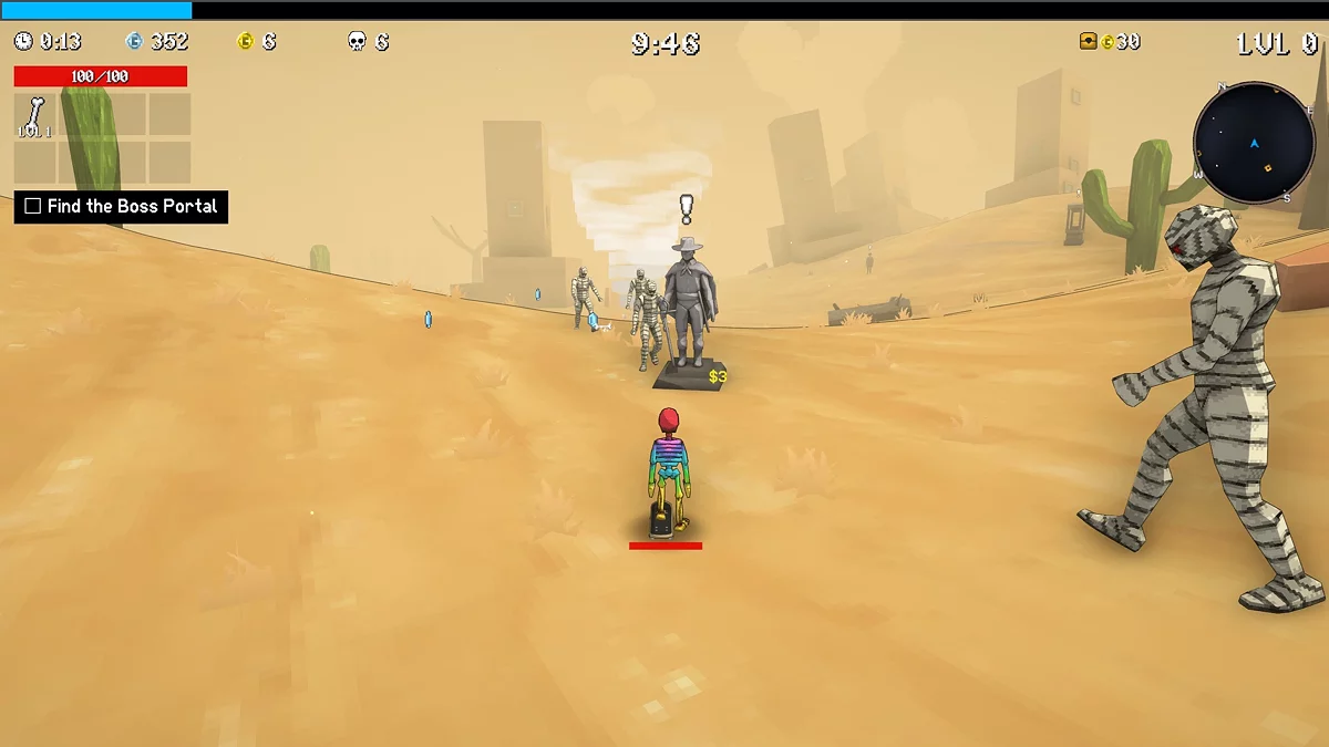 Из павших врагов, глиняных горшков и перекати-поля выпадают маленькие голубые кристаллы опыта. При заполнении синей полоски вверху экрана появляется окно выбора улучшения фолиантов или оружия. До того как вы заполните все слоты, там будут рандомные книги и пушки. Сделав выбор, повышается определенная характеристика.