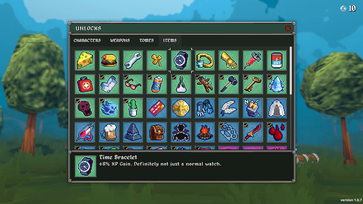 Предметы (Items) — усиления, влияющие на атрибуты персонажа. В игре их более 70 штук, далее перечислим предметы, которые прямо или косвенно влияют на заработок опыта и валют.