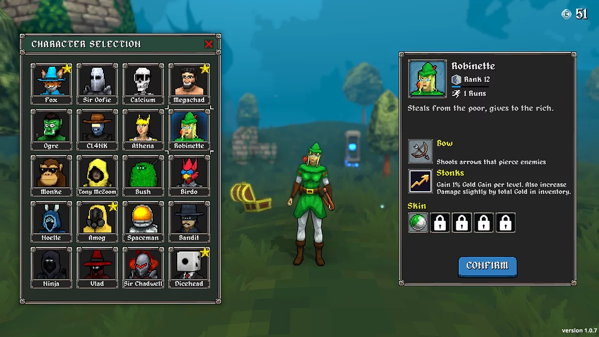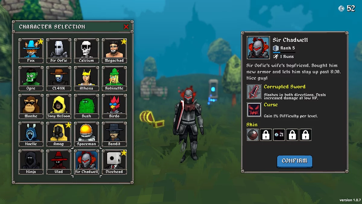 Вы можете играть за персонажа Сэра Чадвэлла (Sir Chadwell), который добавляет 1% к сложности при повышении уровня. Чтобы его получить, пройдите третий уровень леса и убейте финального босса.