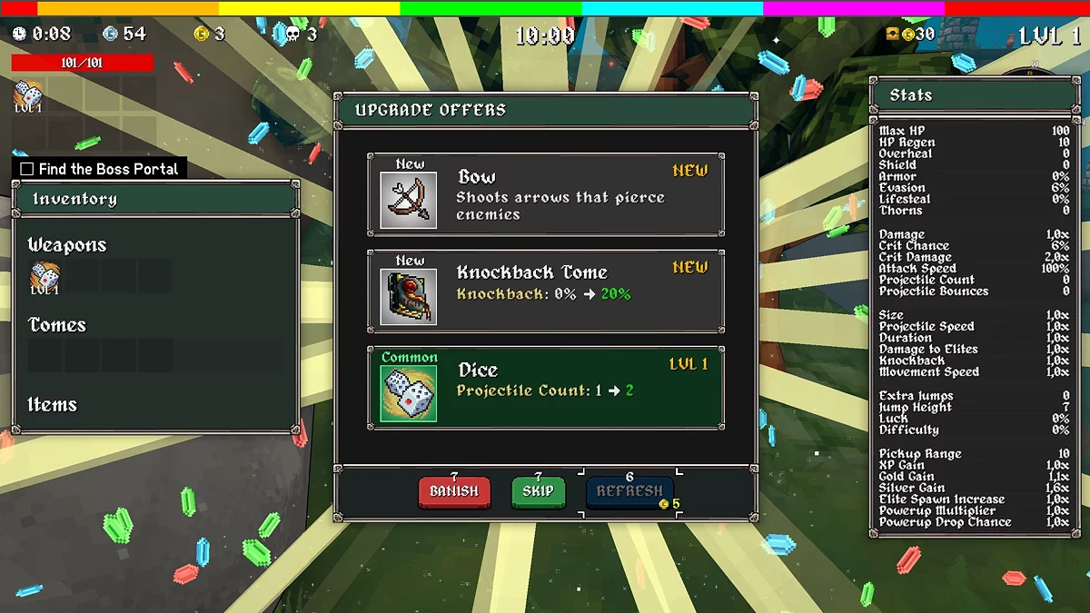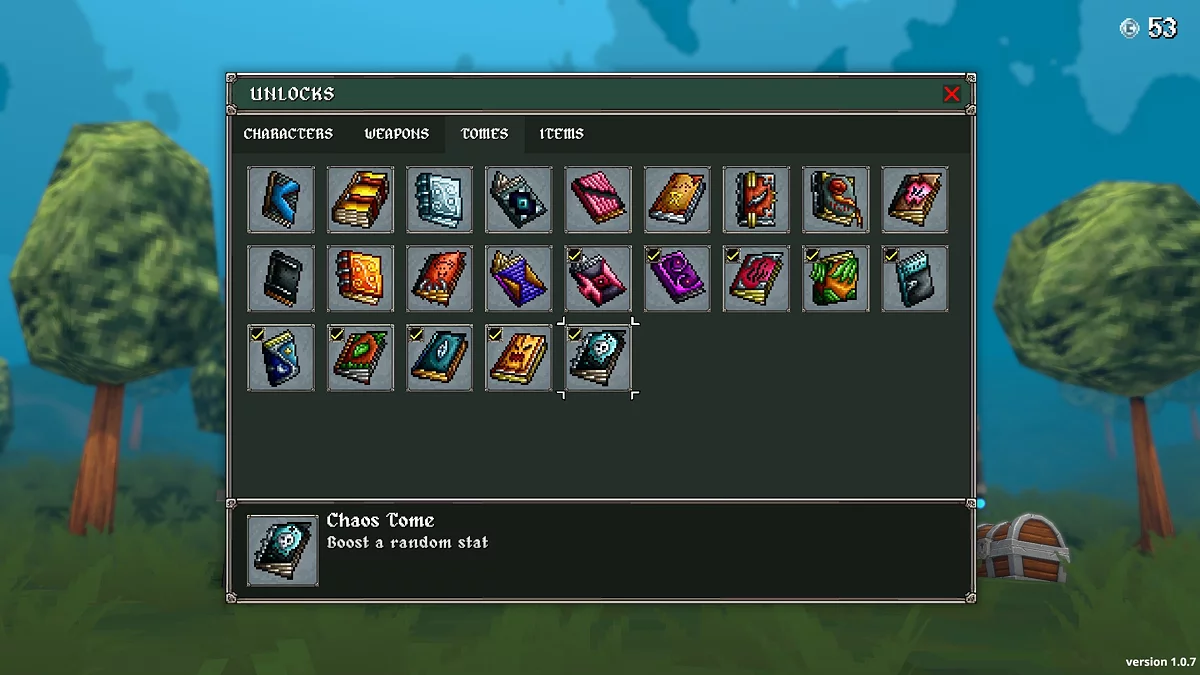 В игре есть персонаж «Кубоголовый» (Dicehead) и том «Хаоса». Их главная особенность — возможность повысить рандомную характеристику при повышении уровня. Чтобы получить героя, завершите 100 испытаний, а для книги нужно пройти все уровни любого биома и активировать каждое святилище.