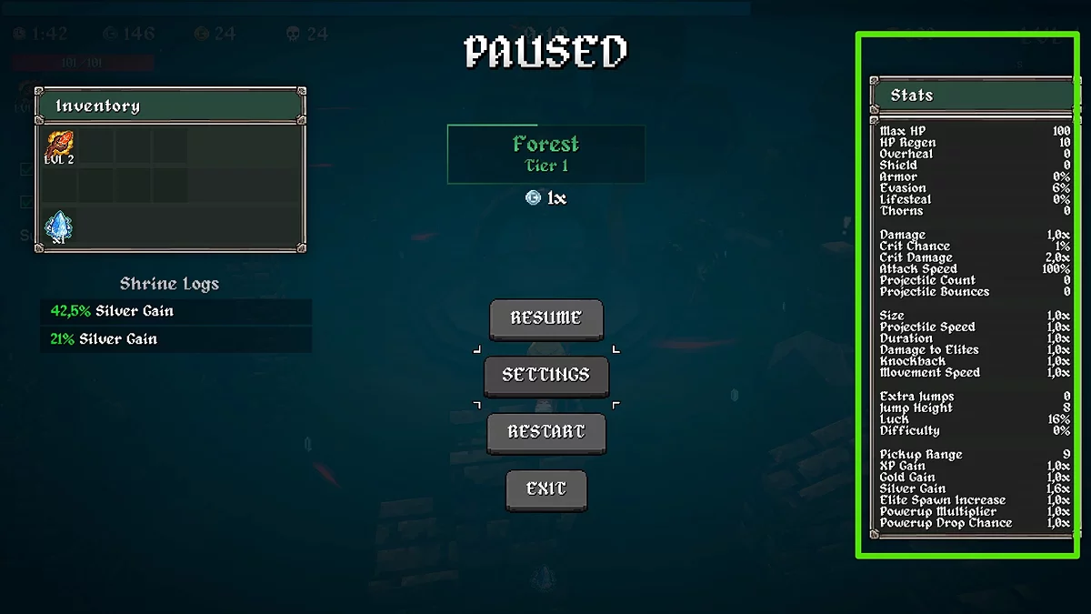Следовательно, увеличение численности врагов кратно повышает скорость добычи опыта, золота и серебра. За счёт того, что с их смертью на земле остаются монетки и кристаллы. Чтобы повысить сложность, активируйте во время забега святыню жадности или используйте фолиант «Проклятие», который можно разблокировать, убив любого босса менее чем за пять минут.