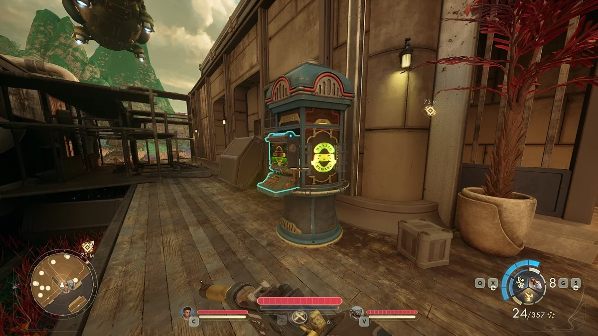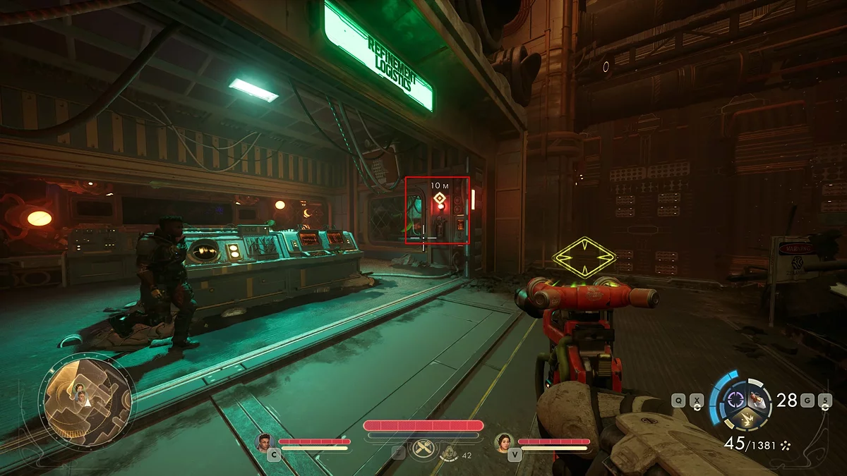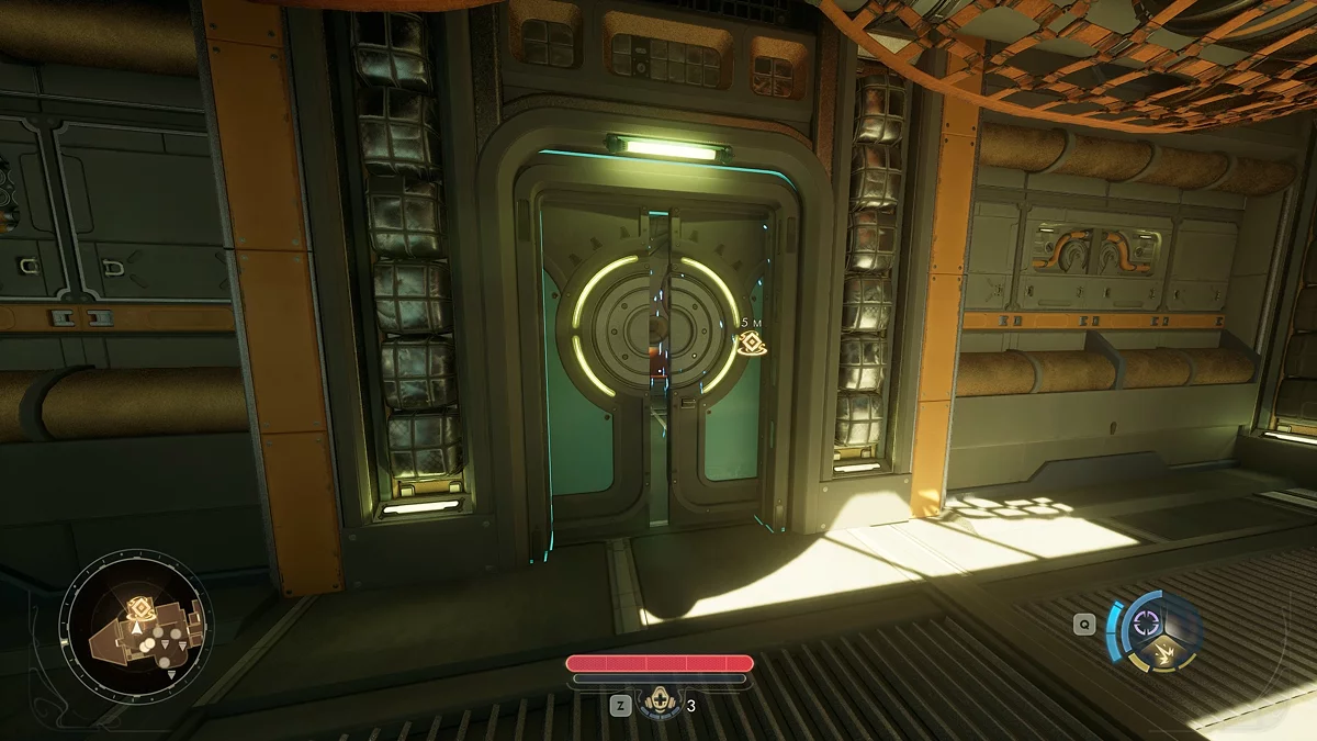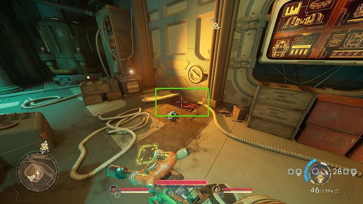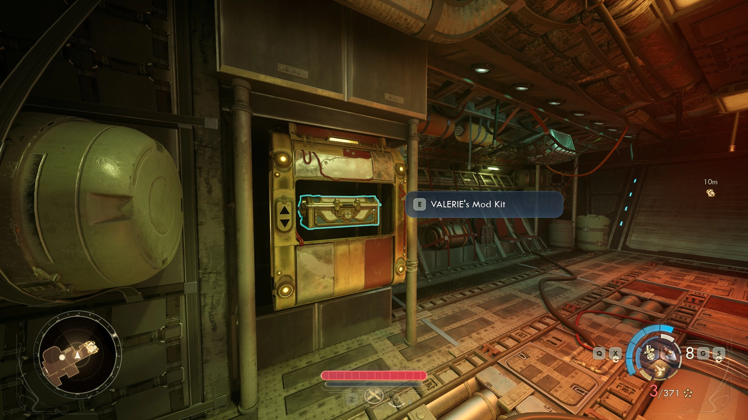 Спуститесь к входной рамке, где встретитесь с Вэлери, которая скажет, что на борту есть особенные сундуки. Они открываются с помощью улучшенного дешифровального ключа (Advanced Decryption Key). Таким образом можно модифицировать андроида. Первую карточку вы получите от робота в кейсе лежит кислотный дематериализатор «Тёти» (Auntie's Acidic Dematerializer). Это устройство предназначено для уничтожения тел. Все остальные ключи можно отыскать в открытом мире.
