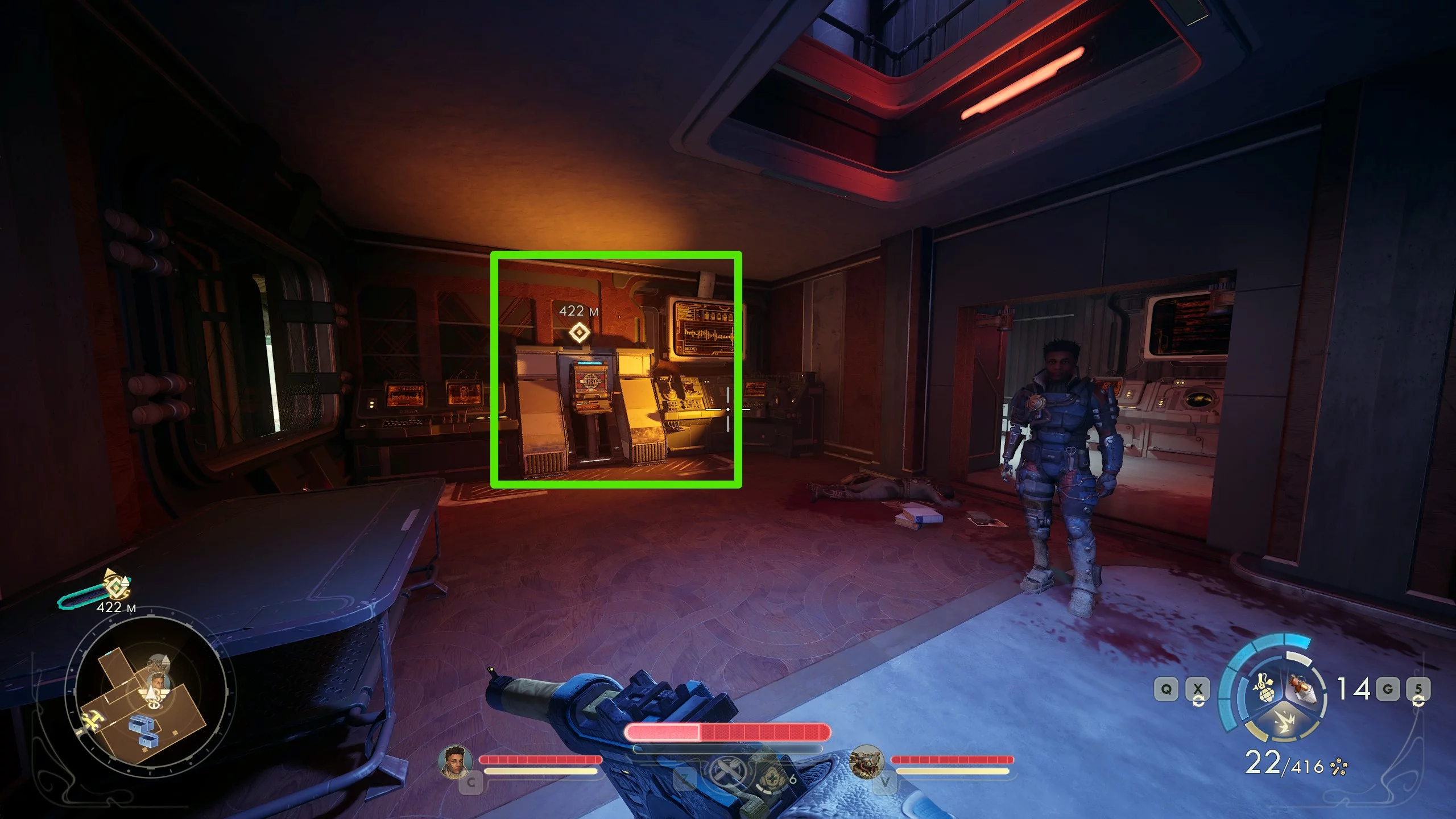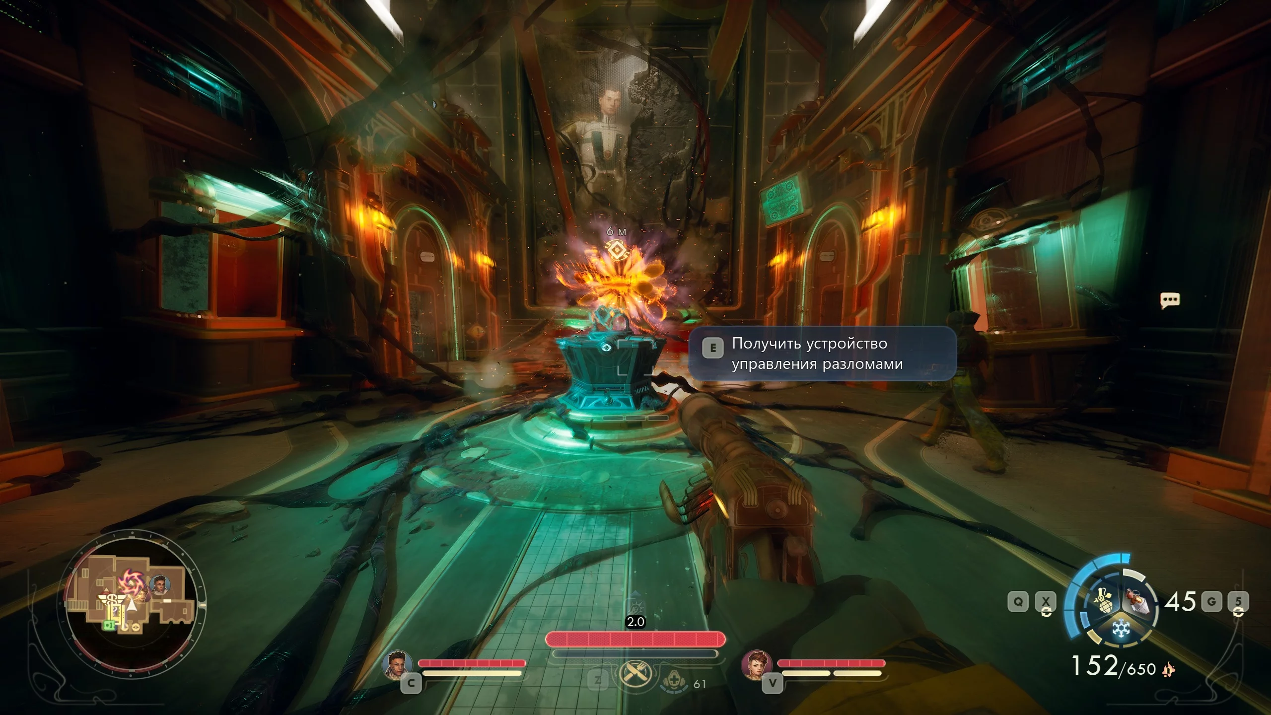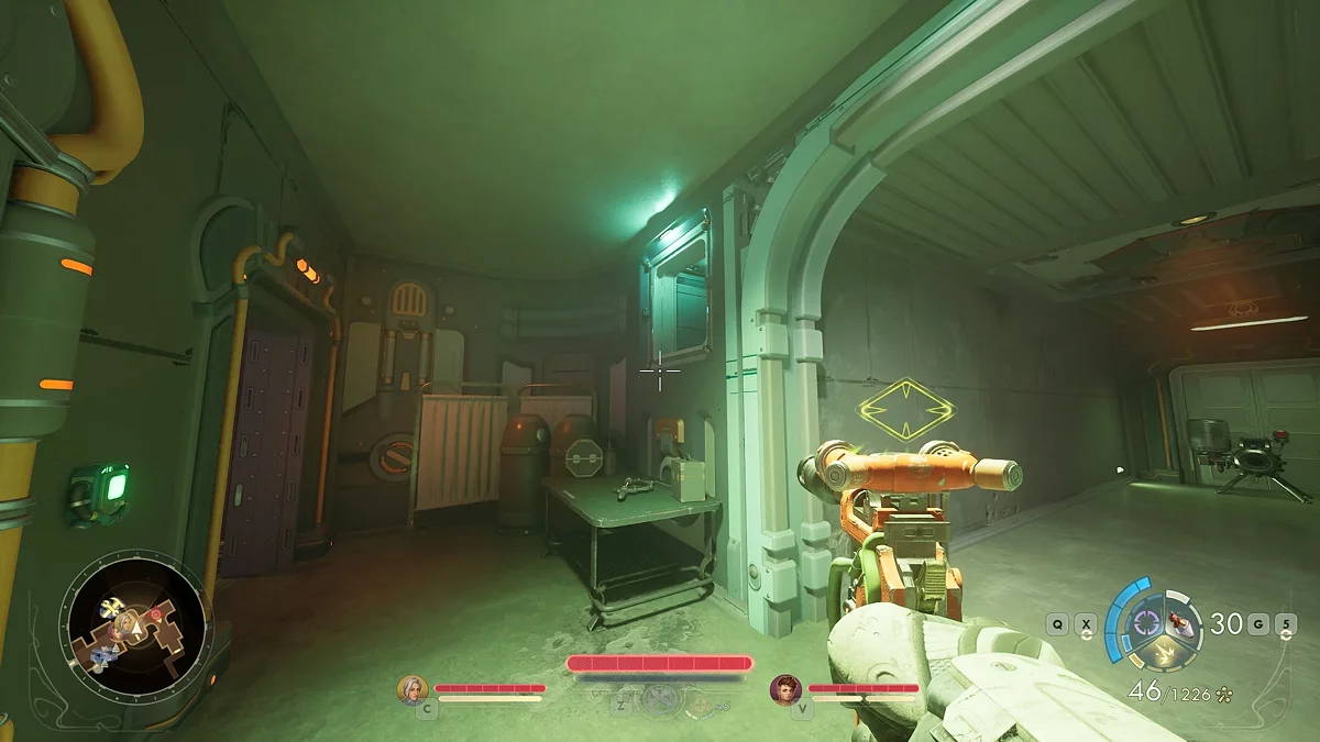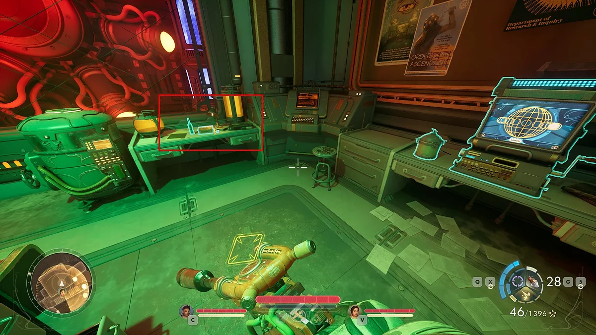По научной палубе бродят ученые. Используйте навыки «Речи», чтобы усыпить их бдительность. Найдите рядом с разломом тело и соберите образец тканей. Войдите в противоположную комнату и воспользуйтесь центрифугой со стола, чтобы получить ценную информацию о разломах.