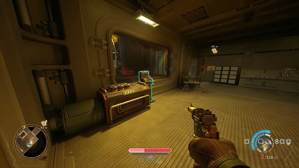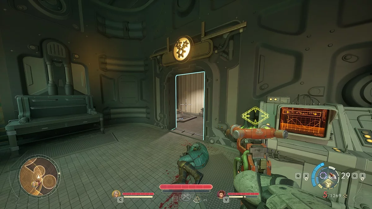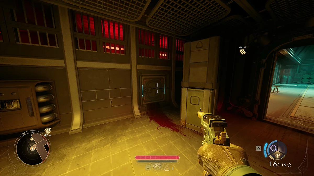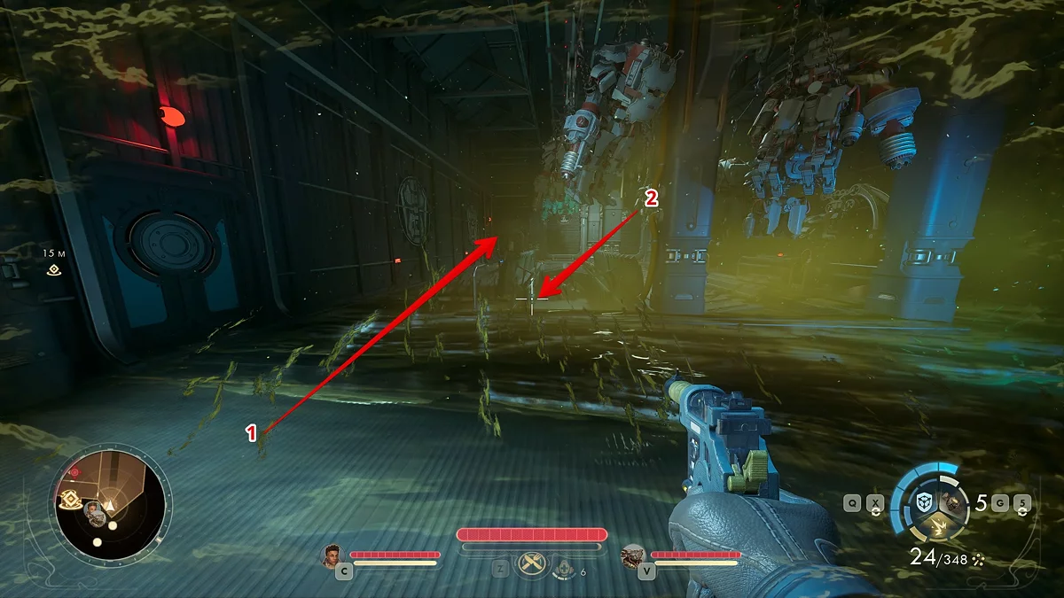 Двигайтесь вперед, пройдите через комнату с автоматоном незамеченным. Войдите в коридор, поверните направо и следуйте в комнату в конце. Обратите внимание на кровавые следы, ведущие к люку. Там вы получите клинок, с помощью которого сможете скрытно устранять противников.