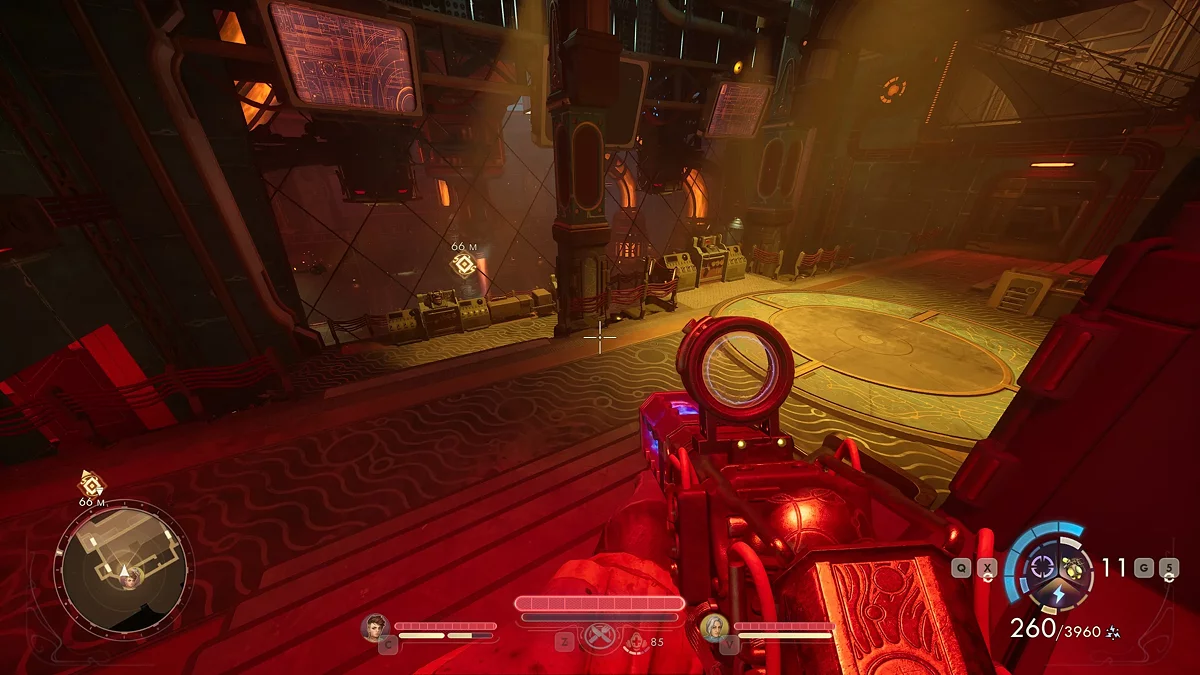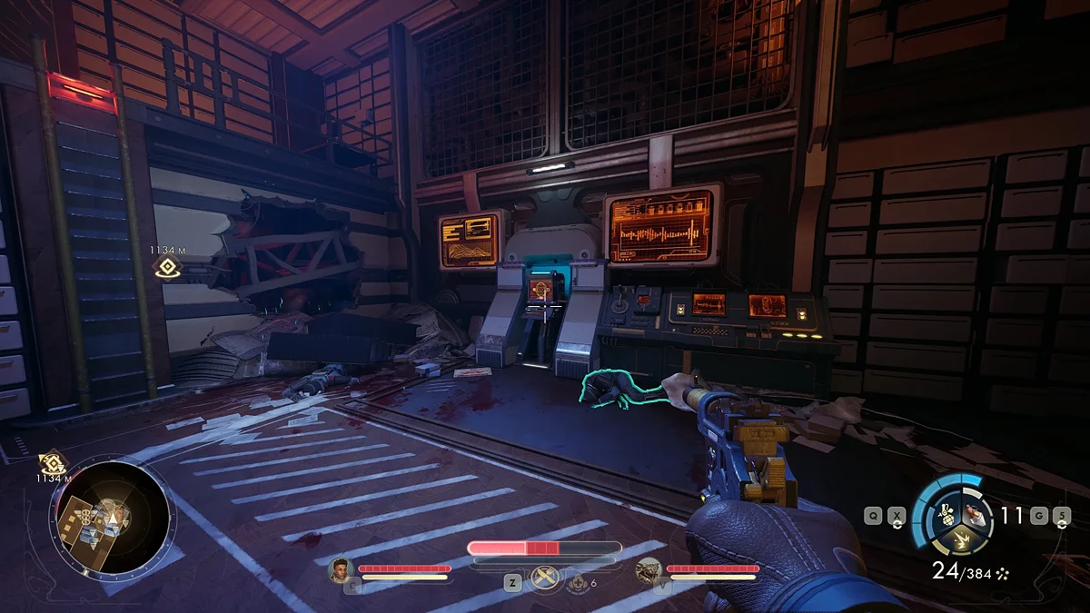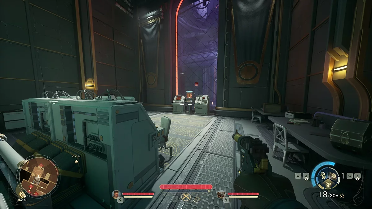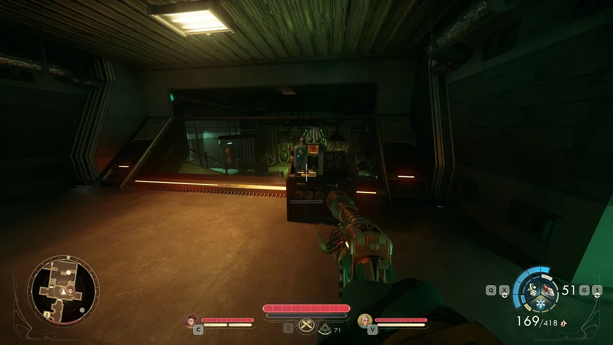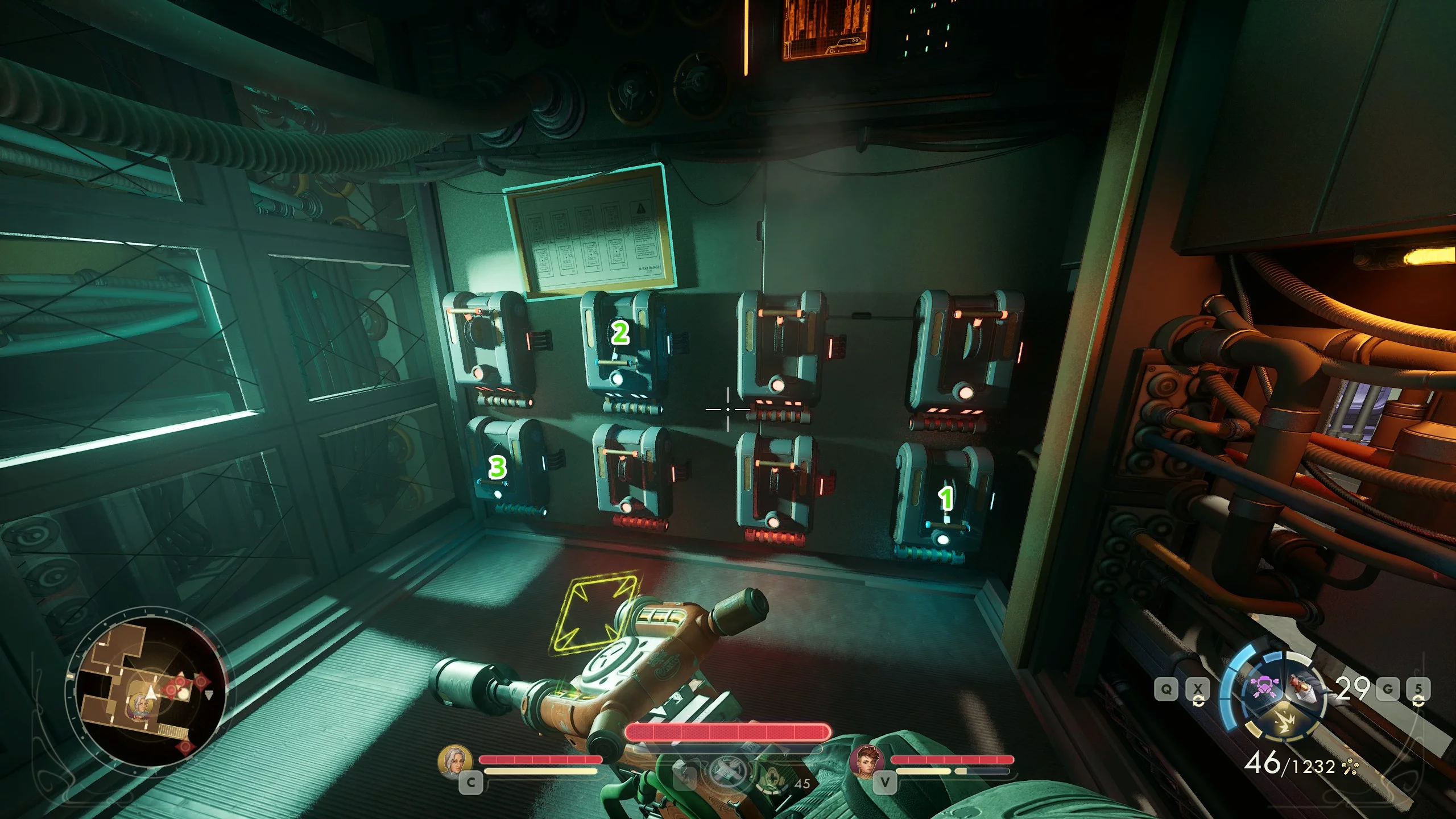 Спуститесь на лифте и двигайтесь направо. Перебейте всех жуков, а затем перезапустите направляющую систему распределителя перфокарт. Пройдите вперед и зайдите в помещение слева, чтобы настроить вертикальную распределительную систему.