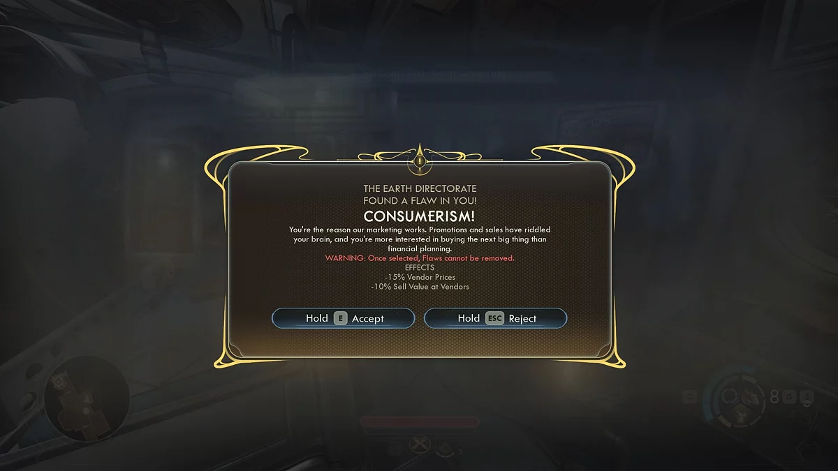 Время от времени в процессе прохождения игры на экране будет появляться изъян, влияющий на характеристики героя. Например, в этот раз будет перк «Потребитель» (Consumerism): -15% цены у торговцев и -10% стоимости товаров при продаже. Они могут иметь как положительное влияние на геймплей, так и негативное. Вы можете либо отказаться от него, либо принять. Важно понимать, что такие свойства присваиваются до конца игры и убрать их не получится.