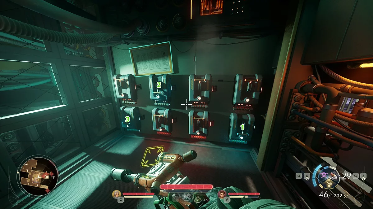 Для этого нужно спуститься в открывшуюся комнату. Перед вами окажется панель с переключателями. Нужно отключить два типа личности ИИ, чтобы остался один на выбор. Мысленно пронумеруйте рычаги от одного до девяти и определите будущее суперкомпьютера. Например, чтобы остался Орден, выключите все, кроме первого, шестого и восьмого, а затем перезагрузите предохранитель справа.