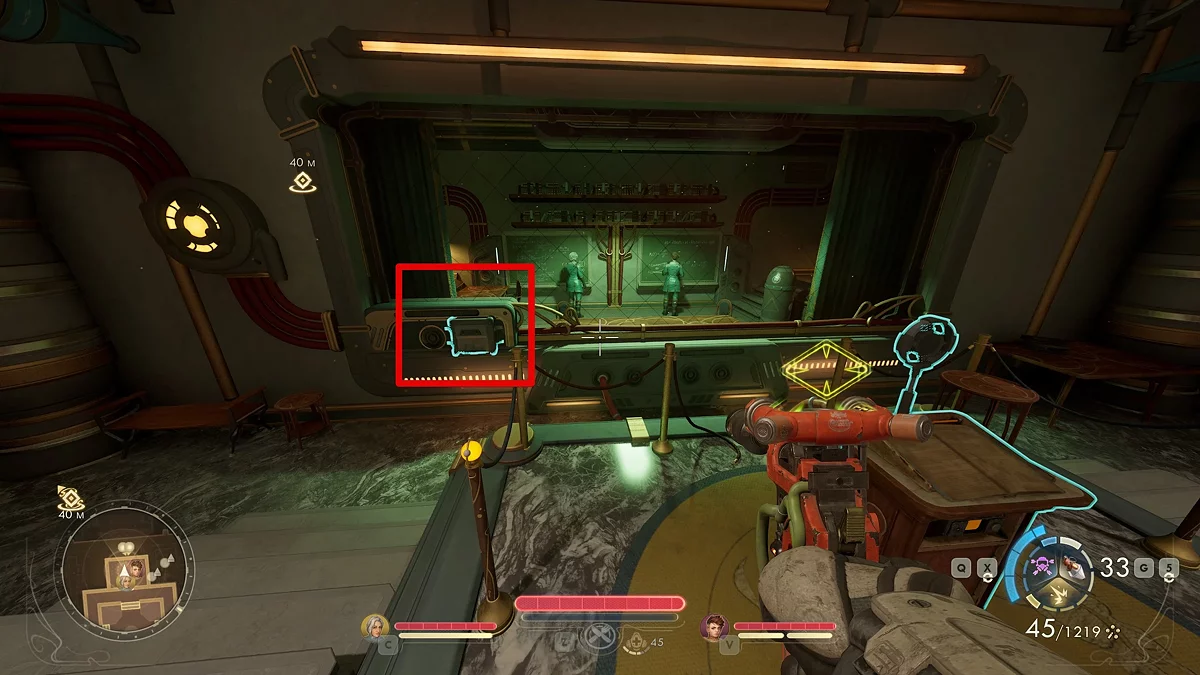 Двигайтесь вслед за союзниками, пока не окажетесь в комнате с интеркомом. Чтобы его активировать, необходимо подать электричество. Поднимитесь на второй этаж, подберите с тела бедж машиниста (Mechanist Badge) и рядом с ним силовой предохранитель (Power Fuse). Вставьте устройство в аппарат, из которого тянется красный кабель. В результате главные двери станции откроются, но активируется система безопасности, и перед входом появится множество автоматонов.