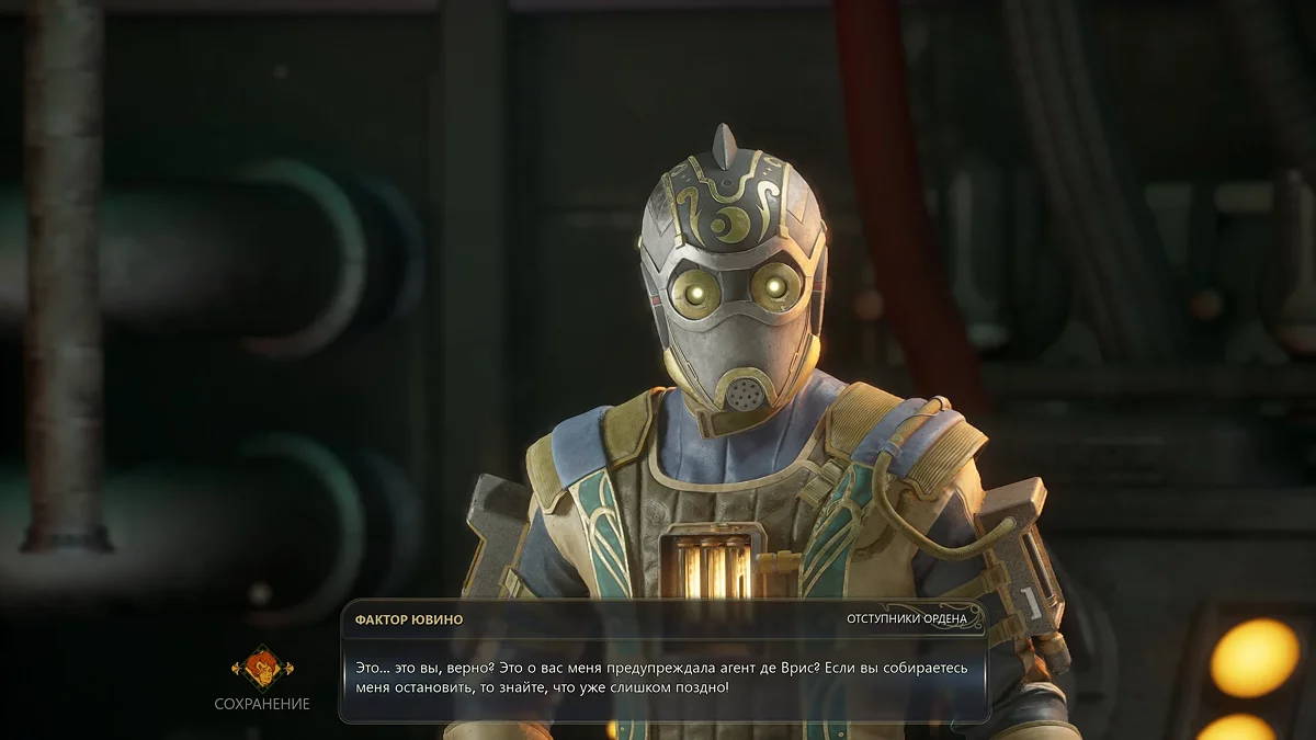 Откройте разлом, осмотрите реконструированный генератор разломов и примените к нему таинственную деталь, а затем подберите восстановленную записку с тела офицера. Поговорите с Хёрли, и выяснится, что Вайланкур по приказу консула покушался на суверена протектората.