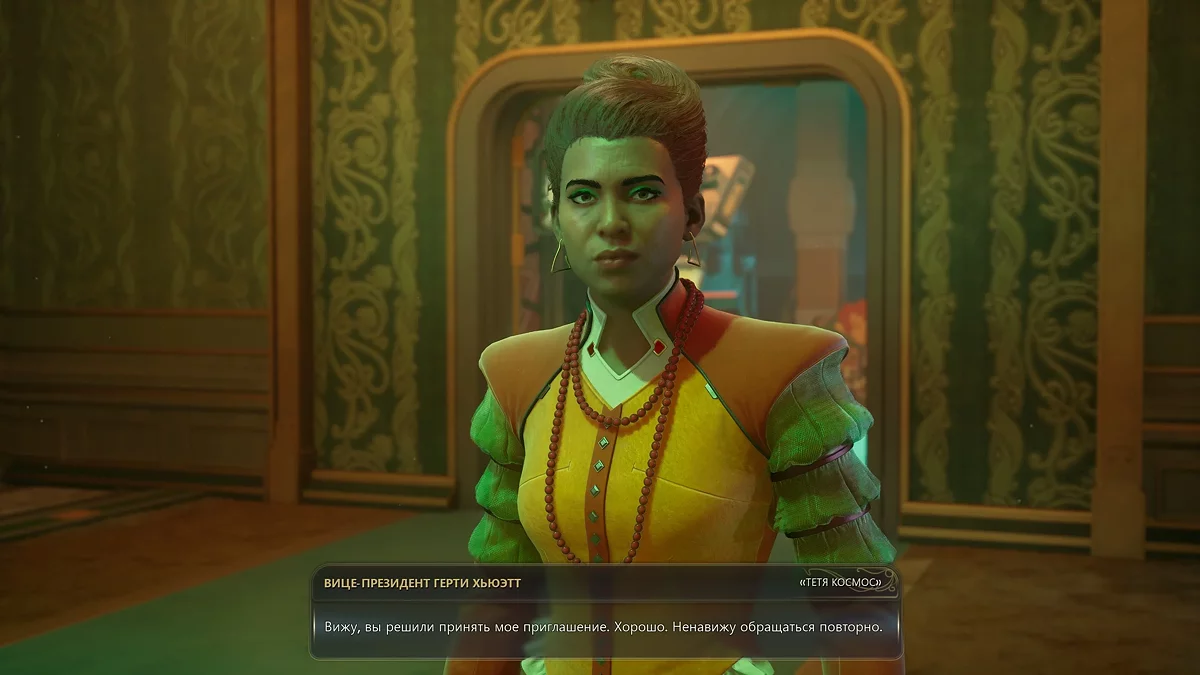 Двигайтесь к ратуше — гигантскому зданию с голограммой на крыше. Внутри увидите, как тётя Клео (Auntie Cleo), глава корпорации «Тётя Космос» (Auntie's Choice), отчитывает министра Милверстрита (Minister Milverstreet) и офицера по внешней политике Куару (Acquisitions officer kaur).