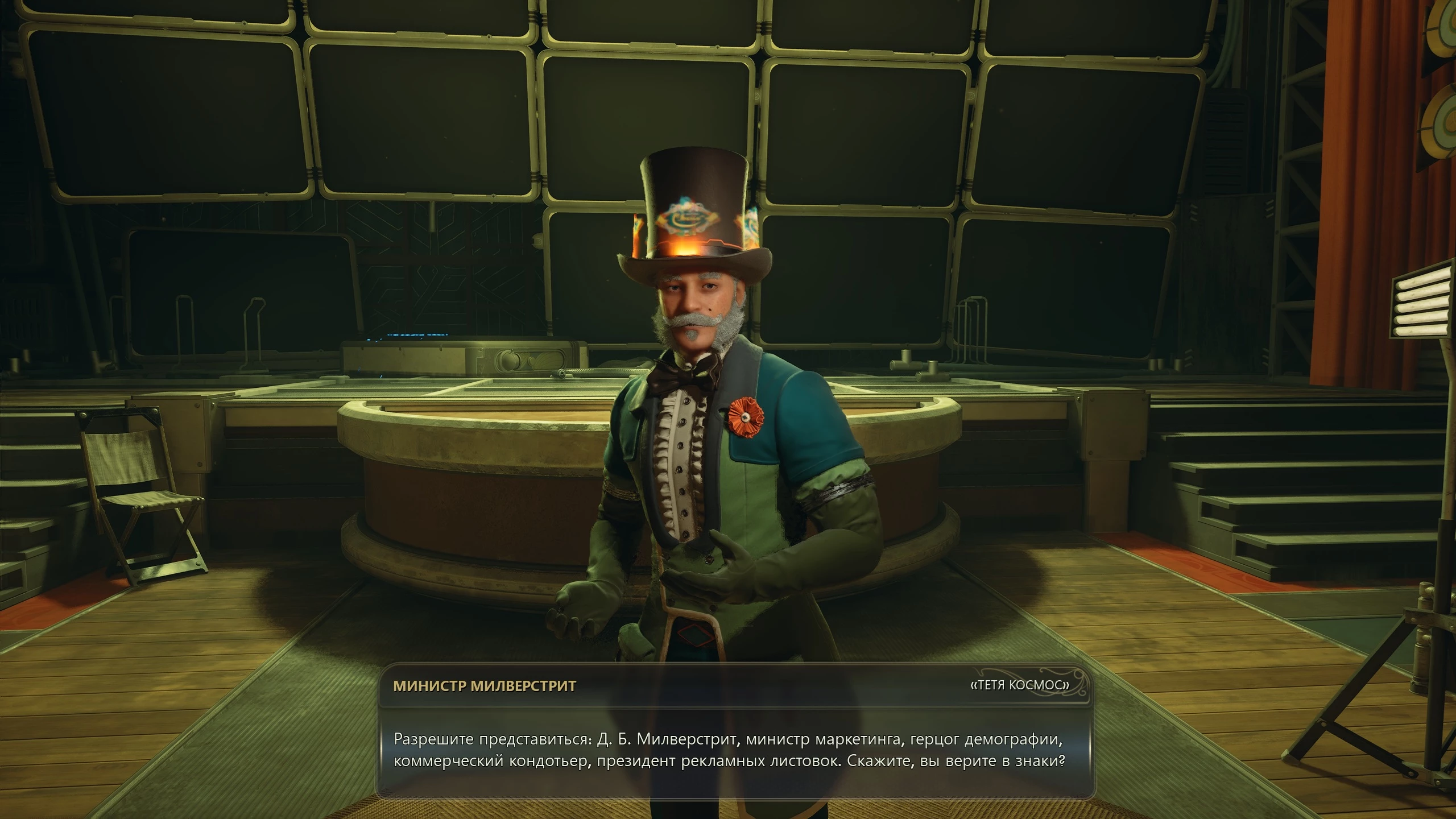 Оказавшись в мэрии, станете свидетелем того, как тетя Клео, глава корпорации «Тётя Космос», отчитывает своих подчинённых: министра Милверстирита и офицера по внешней политике Кауру. В конце созвона мужчина в шляпе подскажет, как искать Августину, и предложит способ попасть на станцию «Глас» в обмен на услугу. Перед тем как принять решение, советуем дочитать этот гайд до конца.