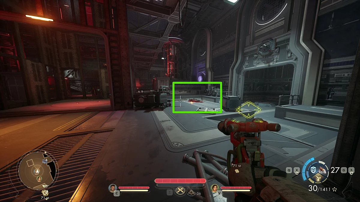 Заберитесь на второй этаж. Двигайтесь в левый угол и заберитесь по желтой лестнице на третий уровень. Подойдите к колонне с красным светильником.