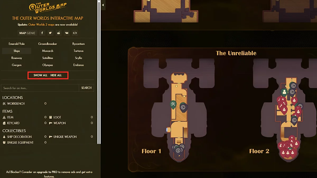 Для управления значками на карте обратите внимание на две кнопки ниже. «Показать всё» (Show All) позволяет отобразить все иконки, а «Скрыть всё» (Hide All) — убрать их. Если вы ищите что-то конкретное, сначала лучше очистить план локации, а затем поставить тот символ, который вам нужен.
