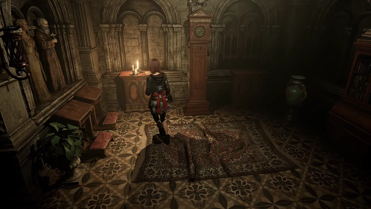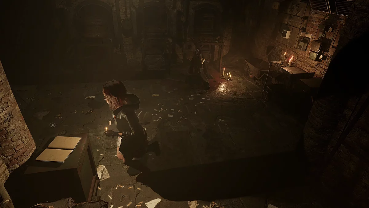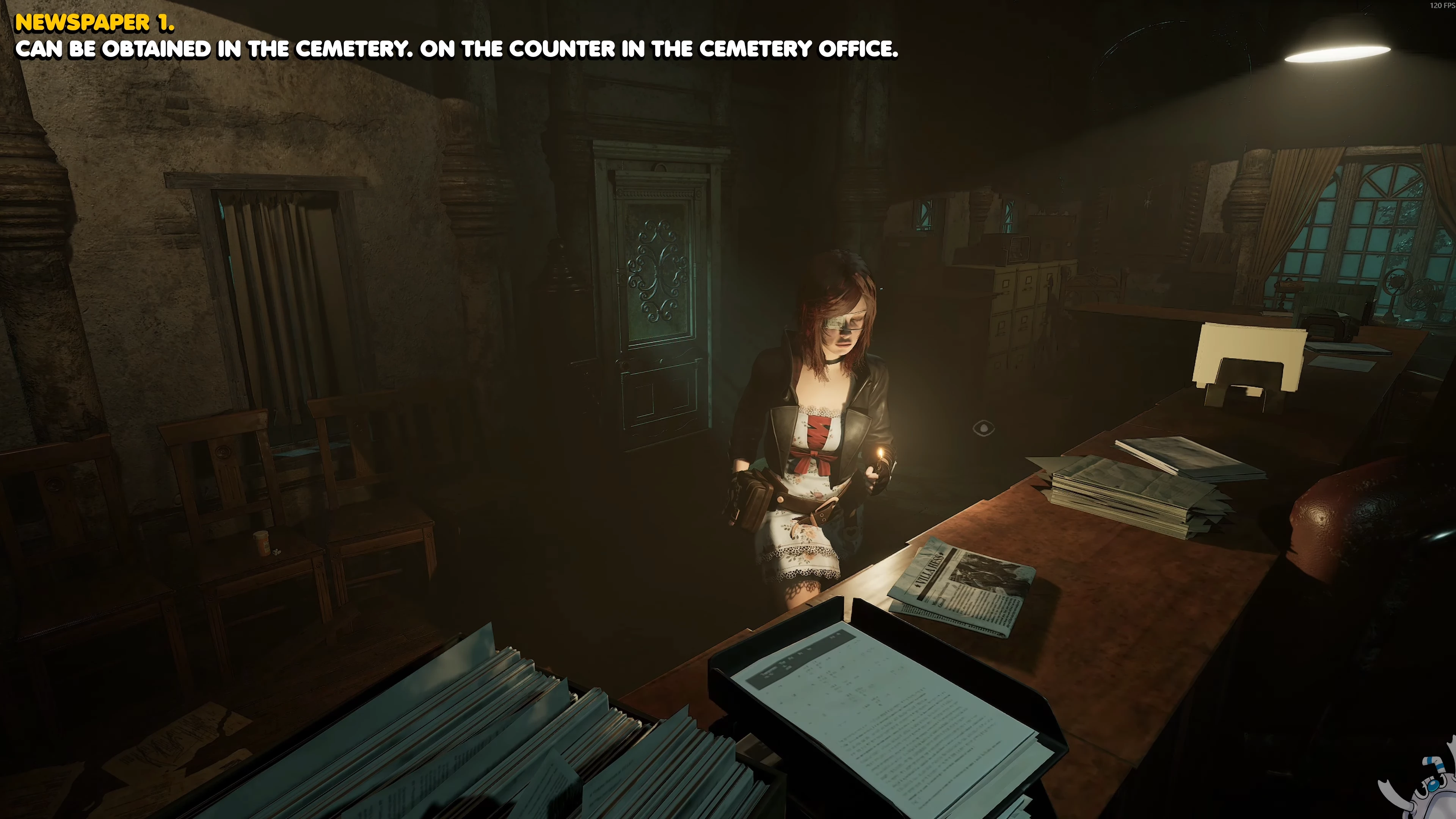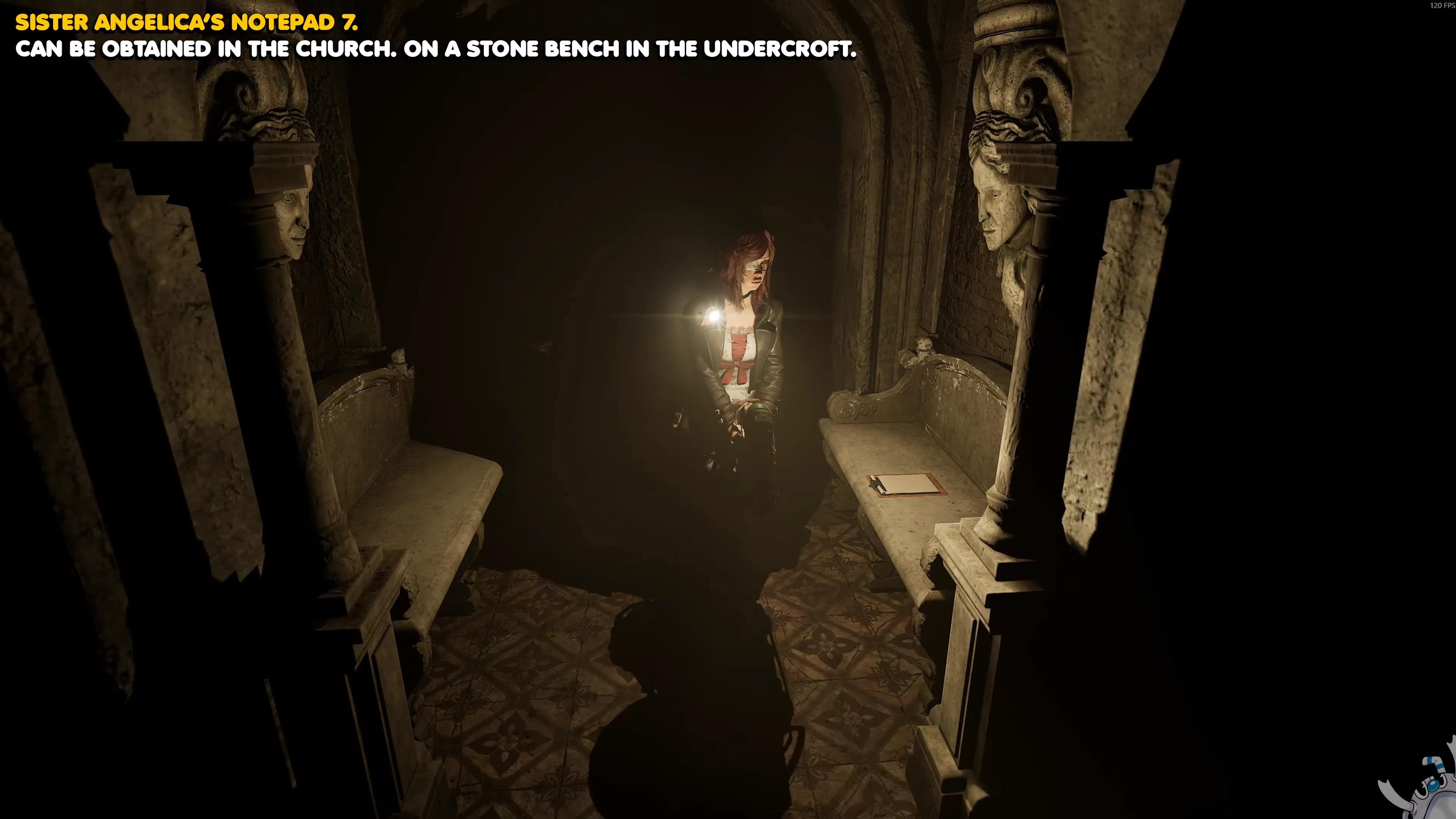 Следующий лист находится в поминальной церкви. Откройте дверь ломом и поднимитесь по лестнице до алтаря, на котором лежит второй блокнот монахини.
