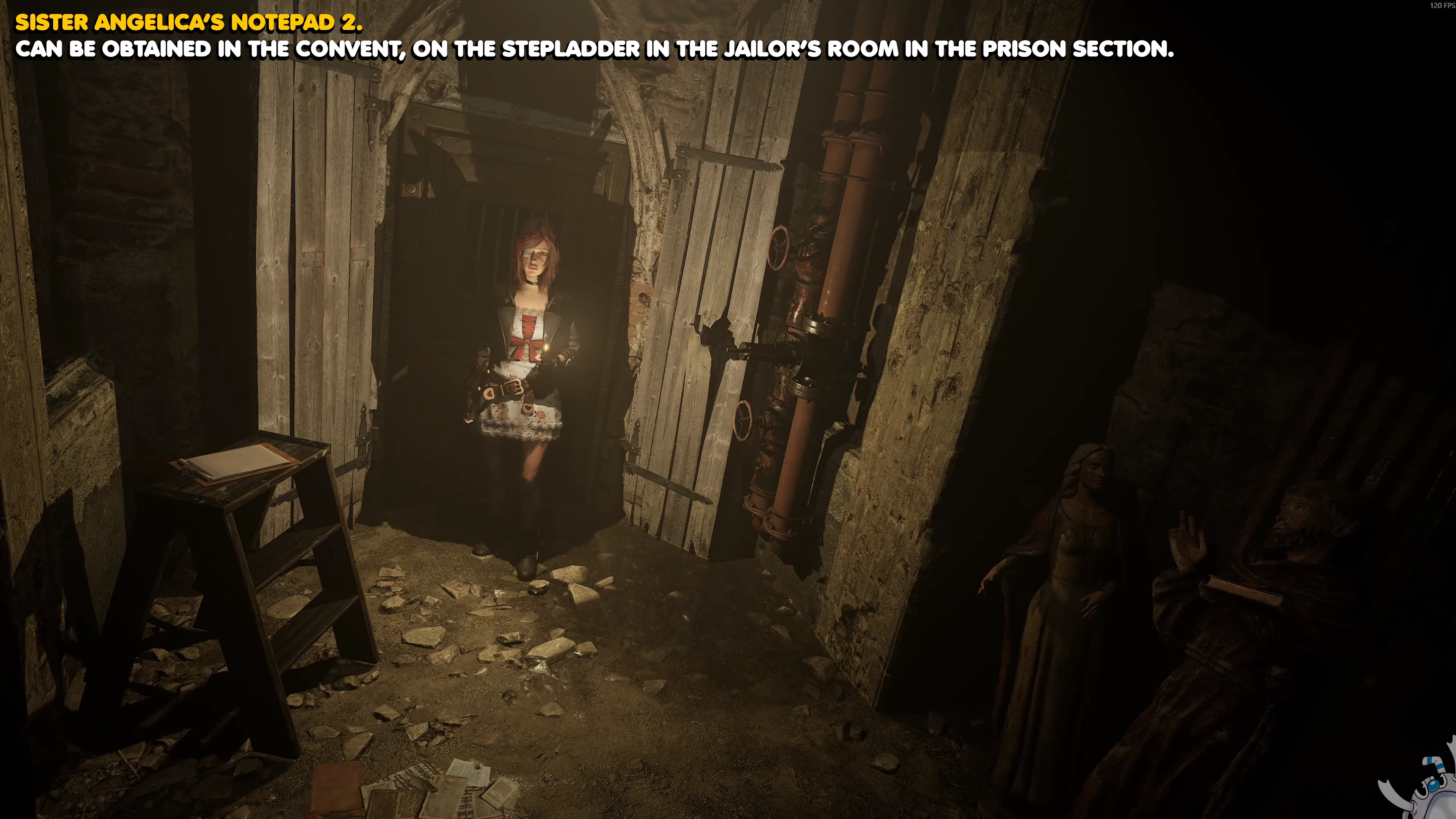 Последняя часть записей монахини находится в канализации под лавкой мясника. После катсцены пройдите по лестницам вглубь комнаты. Рядом с трупом на кровати будет столешница. Подберите на ней последний лист.