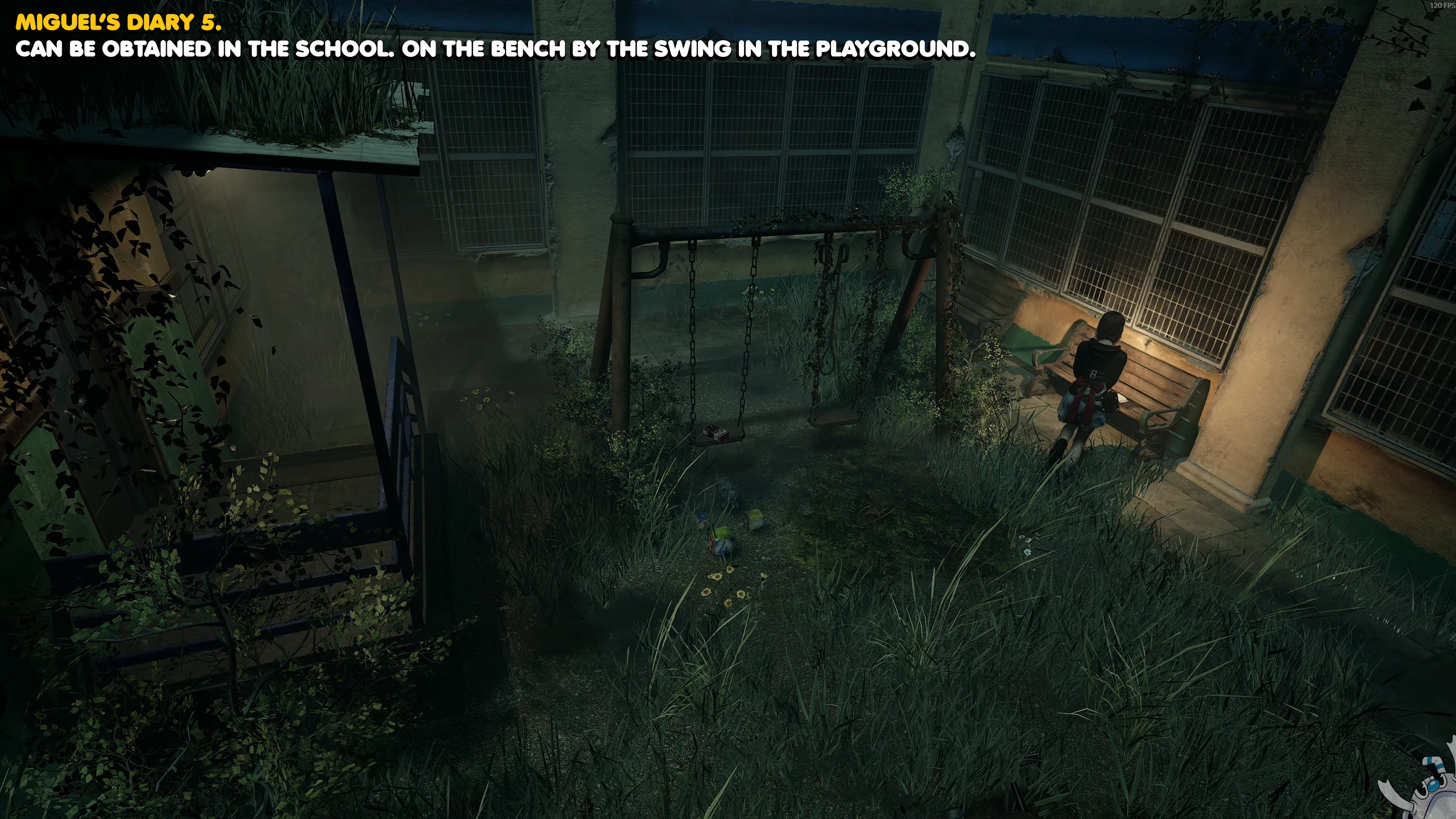 На детской площадке школы подойдите к качелям, после чего подберите пятый дневник на лавочке неподалеку.