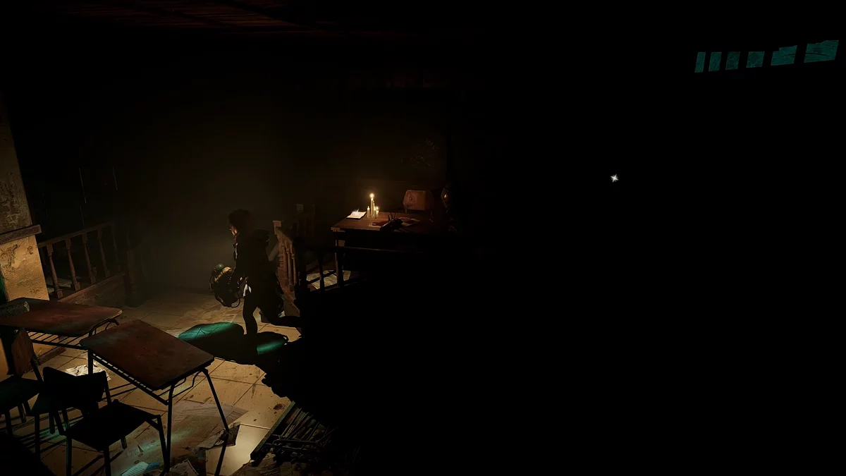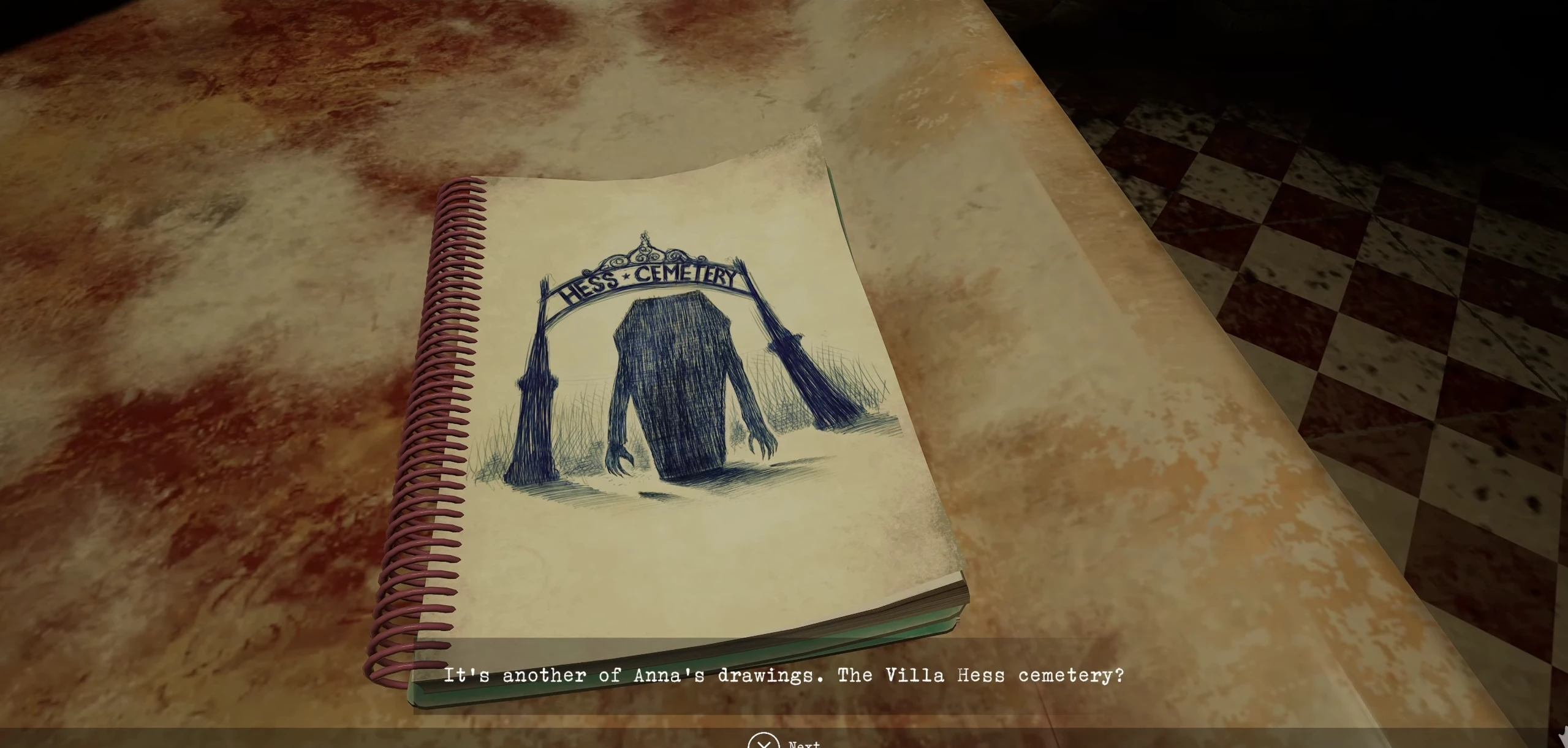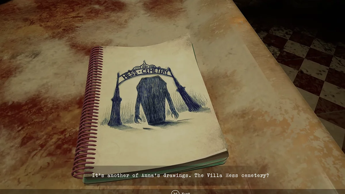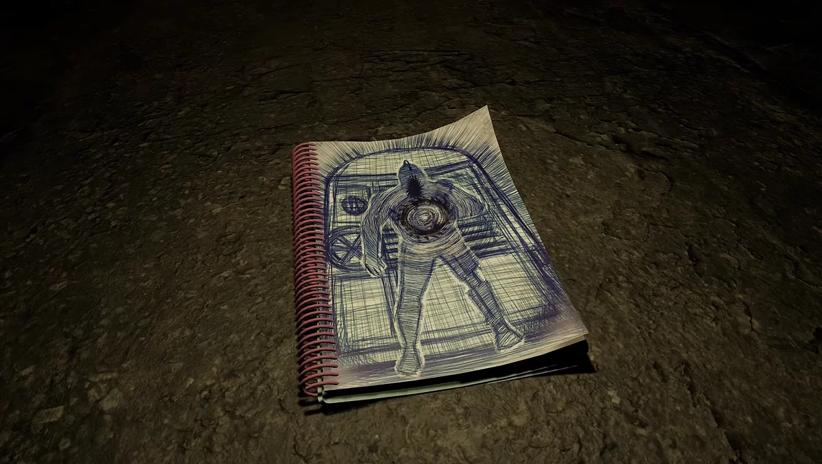 На этот раз пройдите в комнату с генератором и поверните налево. Наверху будет лежать блокнот.