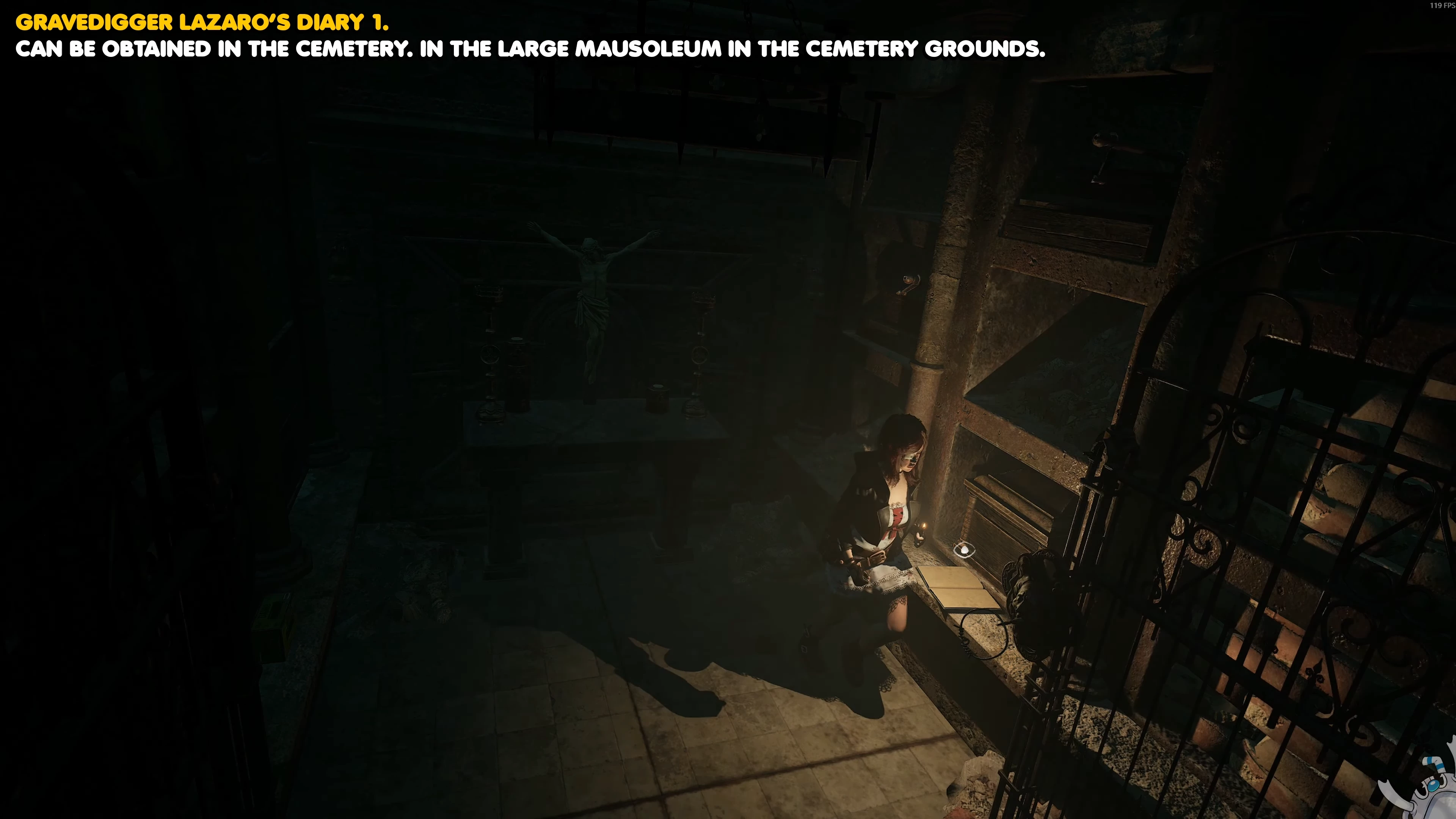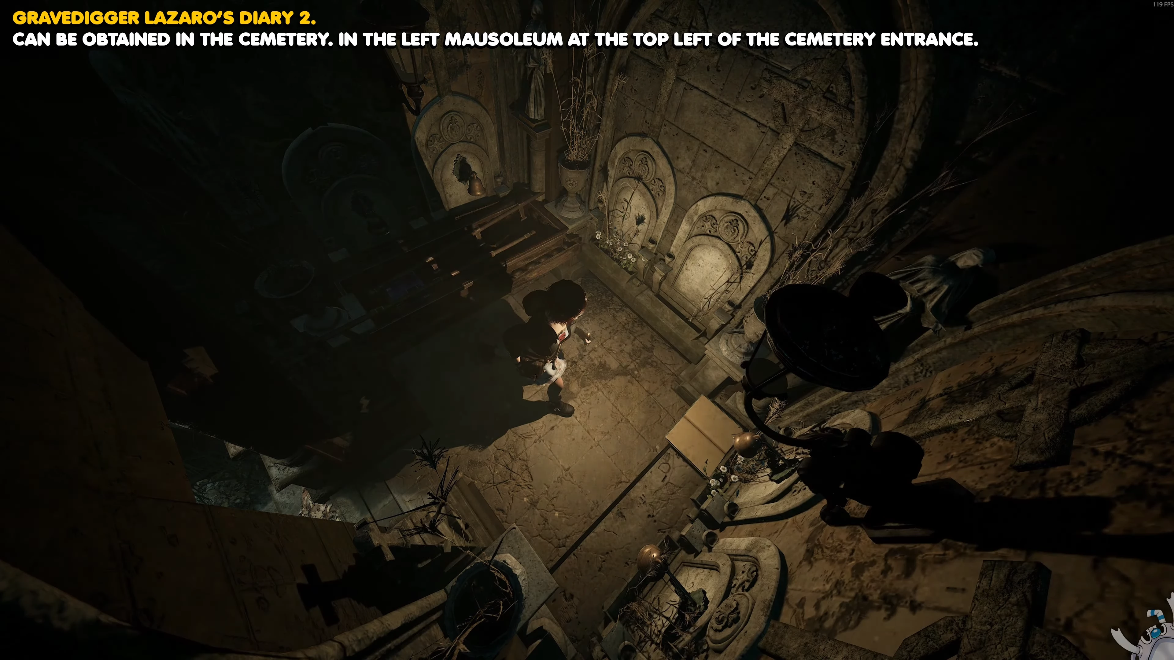 У главного входа на кладбище, перед железными вратами, пройдите в мавзолей слева. На каменной лавочке будет вторая часть дневника могильщика.