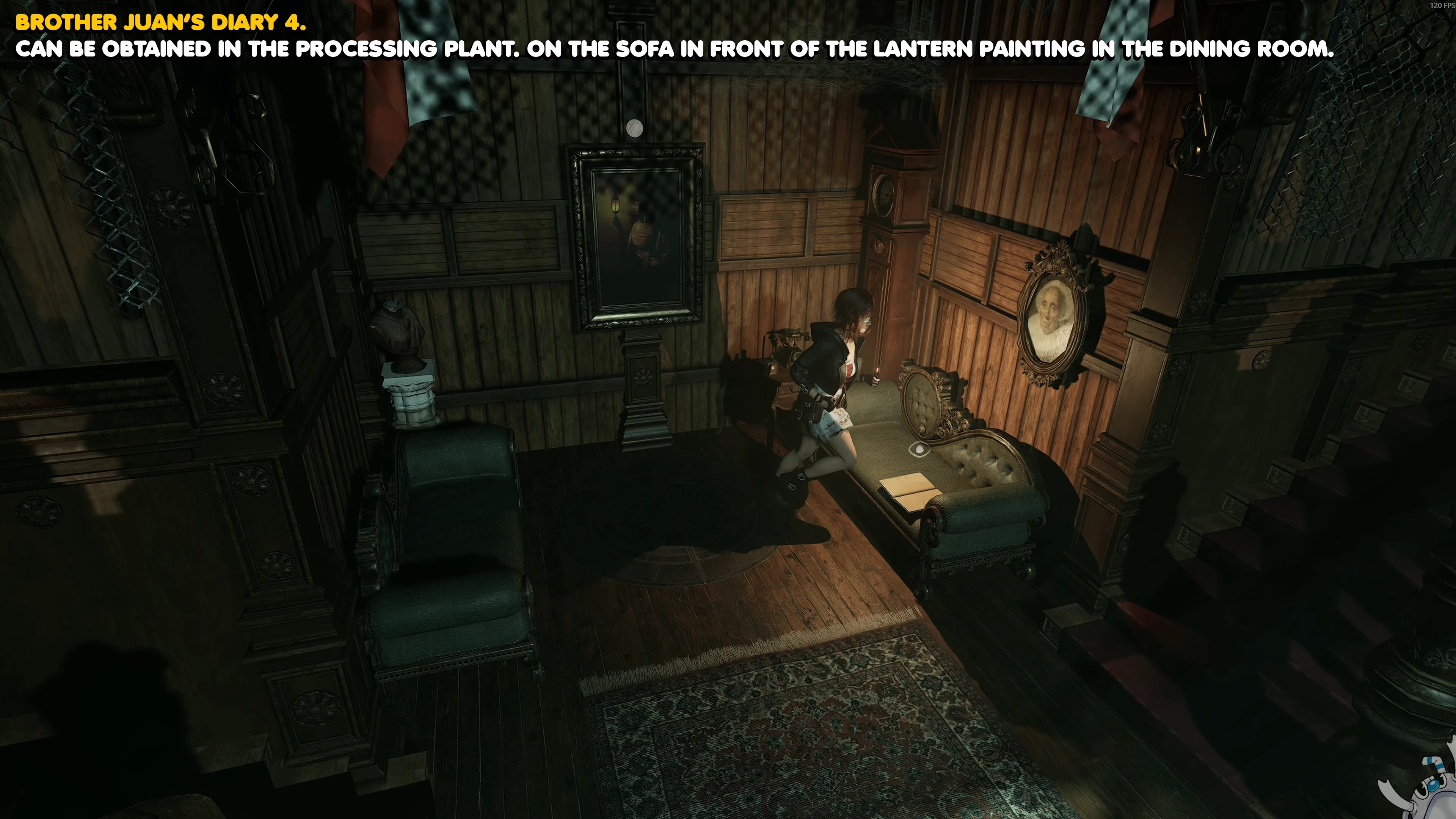Идите к столовой и подойдите к картине с женщиной и лампой. На диване рядом расположен четвертый дневник.