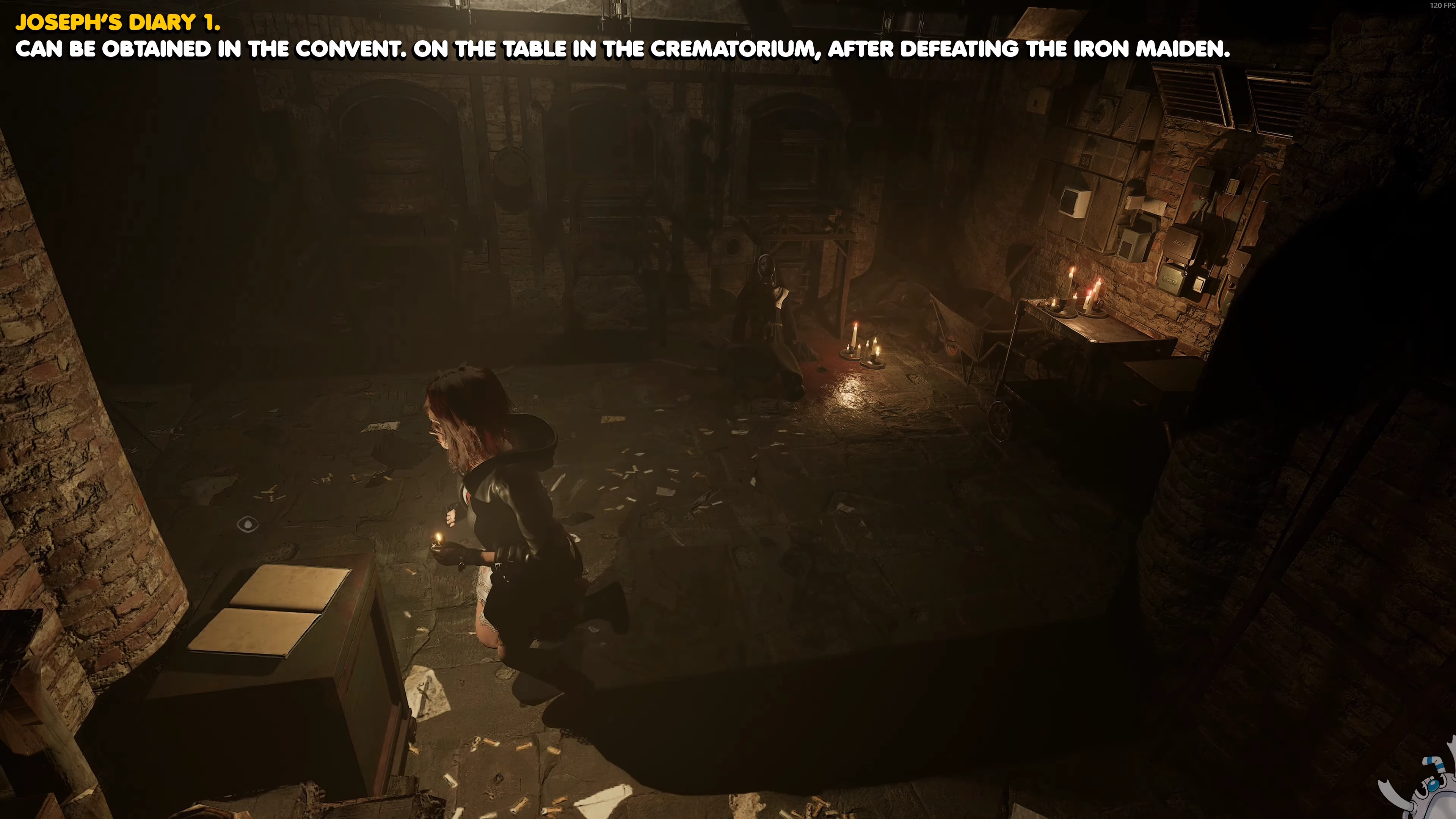 Вернитесь в крематорий после победы над Железной Девой в приделе Богоматери и заберите дневник на ящике.