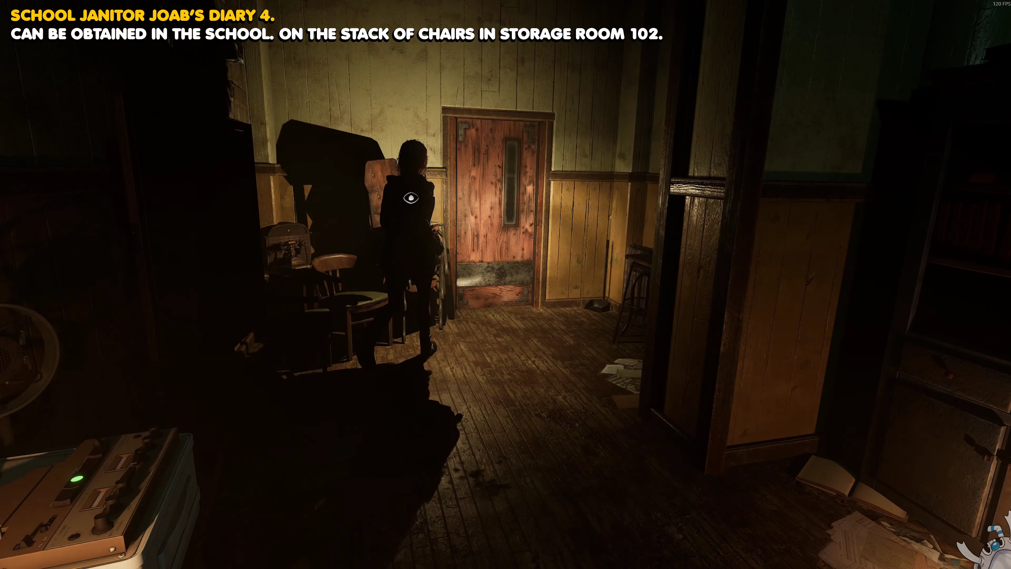 Направляйтесь вглубь коридора за железной решеткой в комнате уборщика. Перед лестницей наверх стоит скамейка с последней частью дневника уборщика.