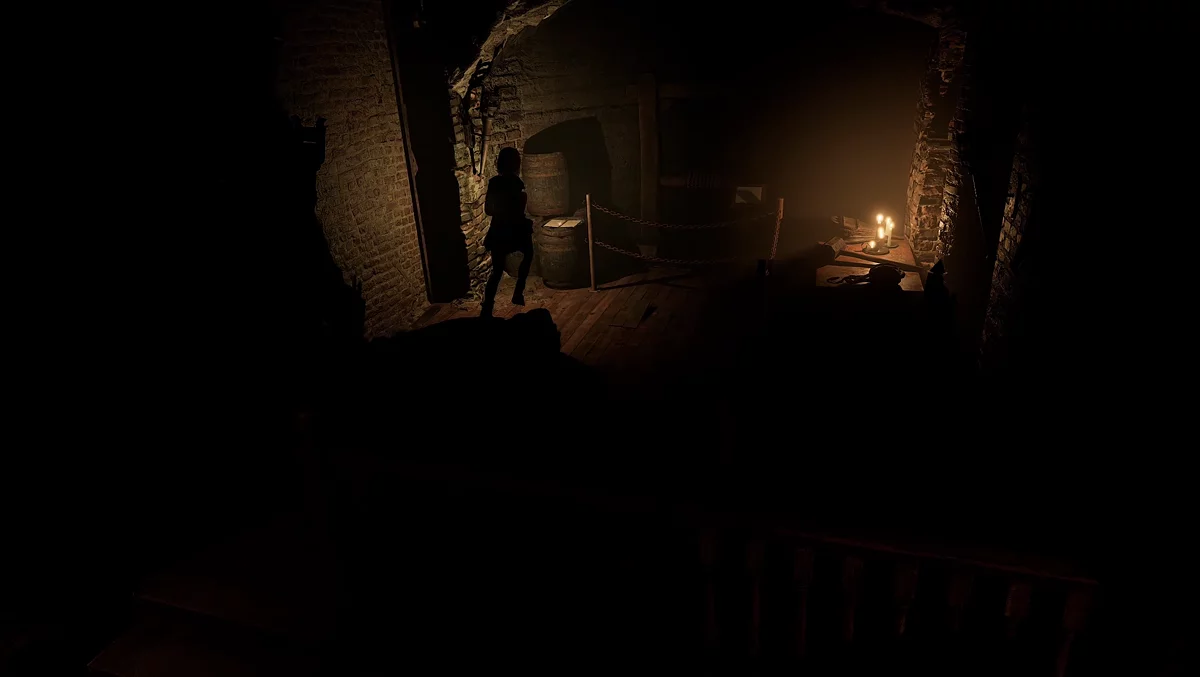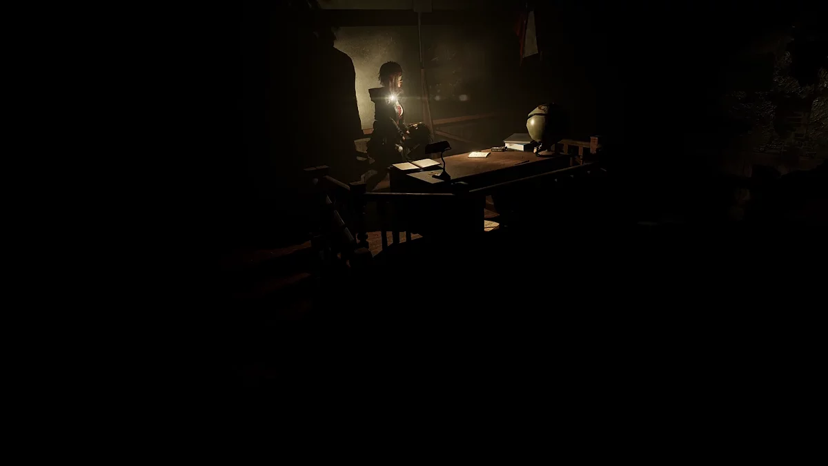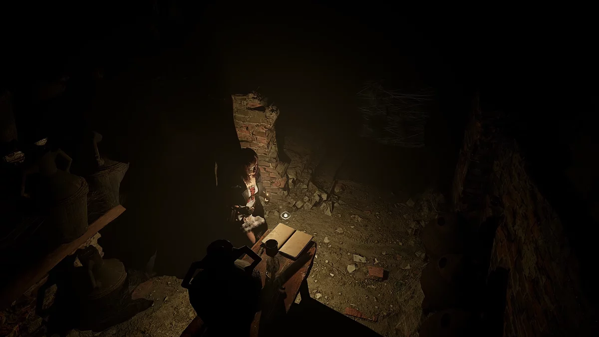 По пути к проклятой книге в темнице обители вы увидите руины со скелетами и ветхой деревянной мебелью. Пройдите по коридорам и подберите записи на столе.
