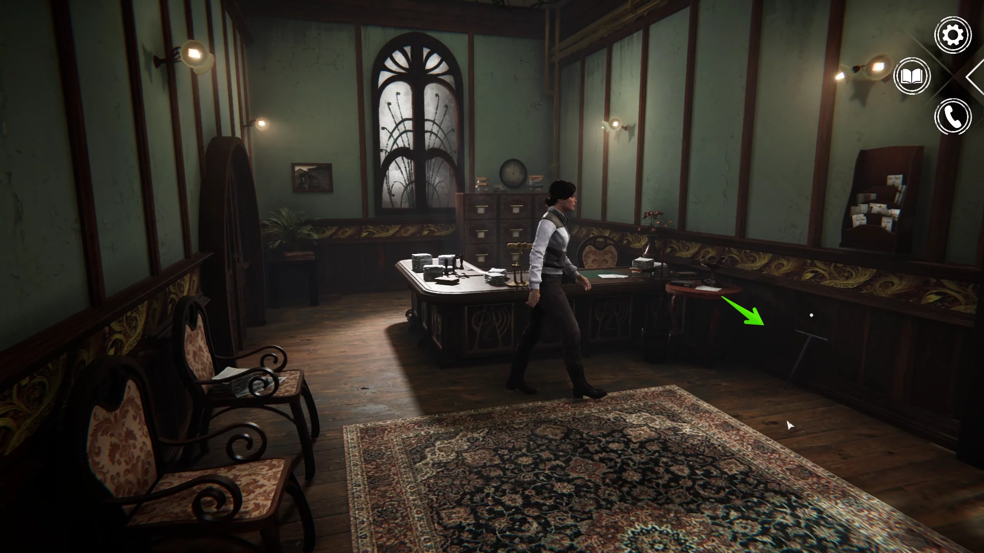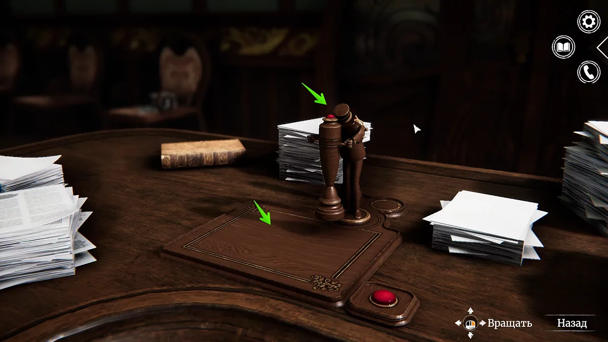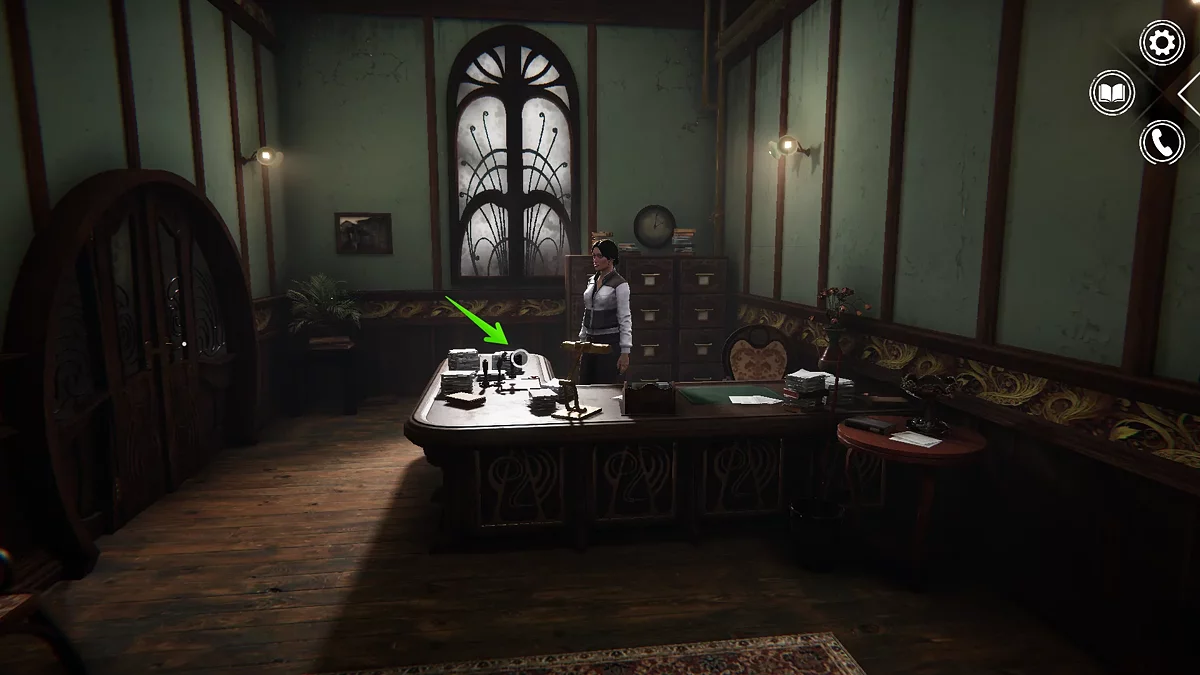 Внутри садитесь на стул перед мужчиной — это нотариус. Задайте все доступные вопросы. Из разговора вы узнаете, что сделка по продаже фабрики временно невозможна, так как перед смертью Анны Форальберг выяснились новые обстоятельства. После беседы вернитесь в холл и, слева от выхода, заберите металлический предмет в форме ключа — он понадобится для доступа на фабрику автоматонов.
