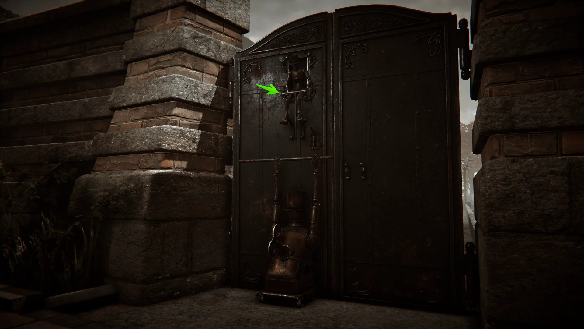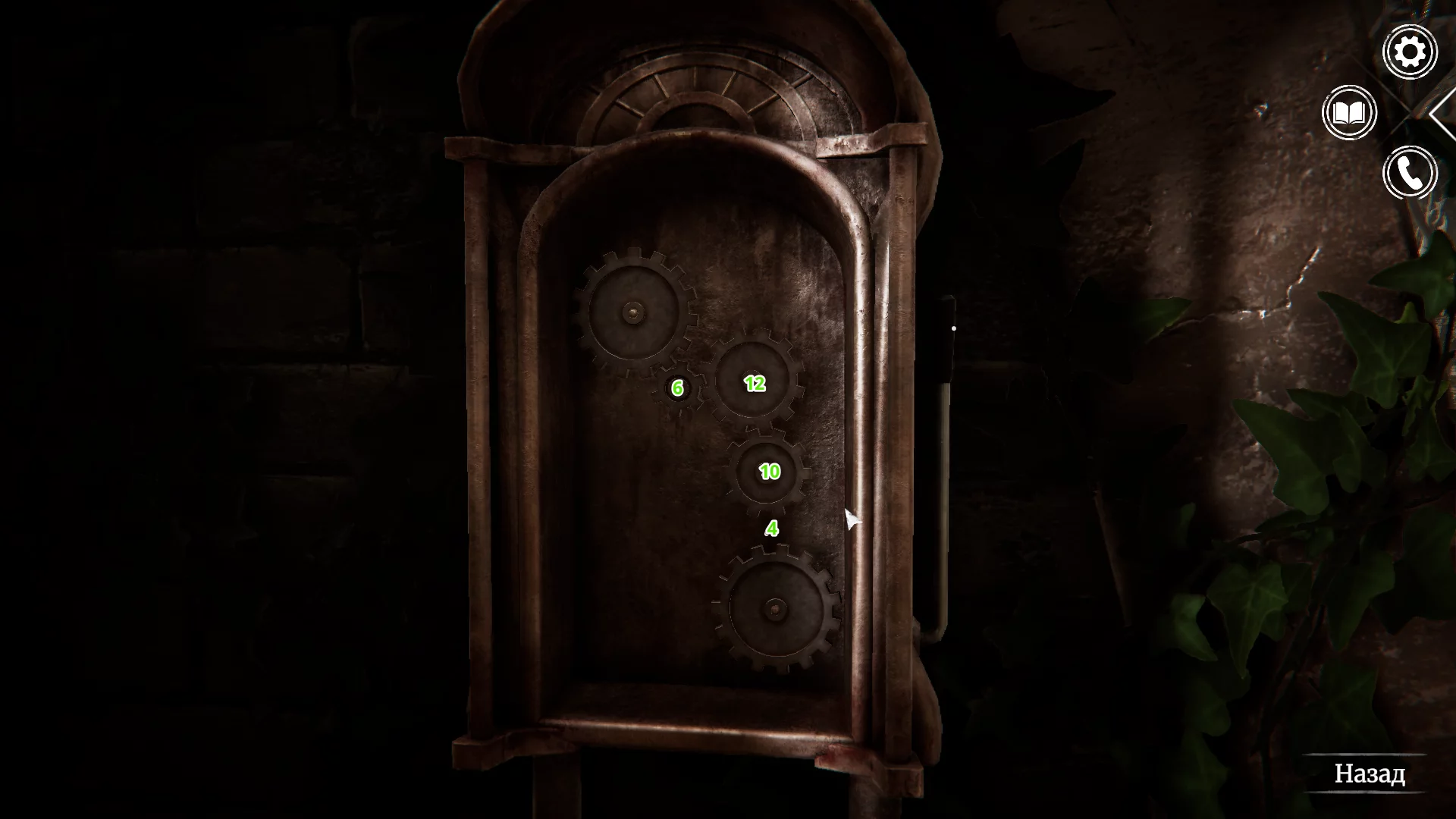 На территории кладбища обойдите церковь по правой стороне. Слева вы заметите дверь с механизмом, в который вставляются шестерёнки. Если вы ранее забрали четыре шестерни у Момо в холле отеля, установите их в следующем порядке (сверху вниз):