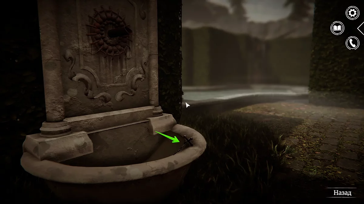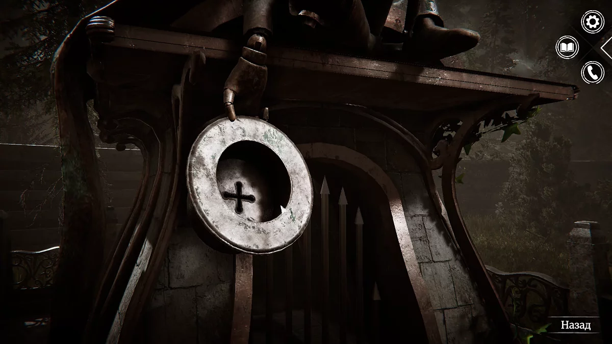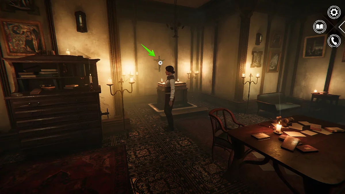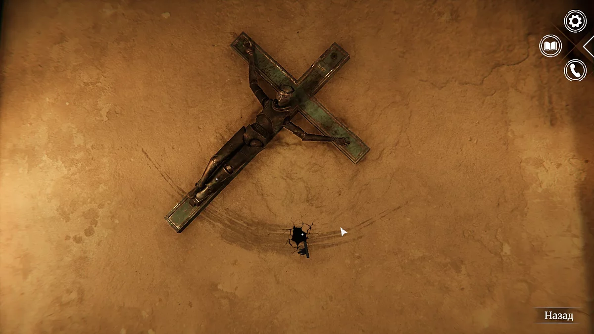 Зайдите в помещение. Слева на стене висит распятие — осмотрите его. При взаимодействии распятие можно поворачивать, открывая потайное отверстие за ним. Внутри вы найдёте ключ, торчащий из замка.