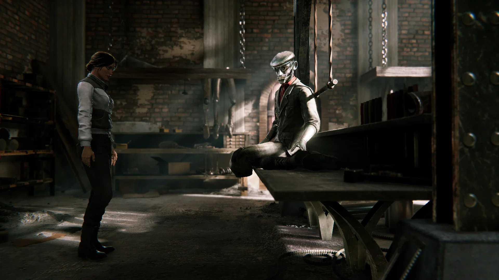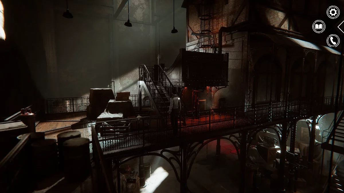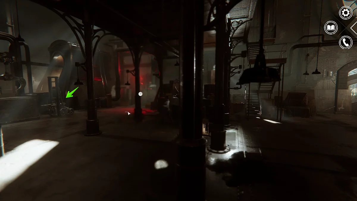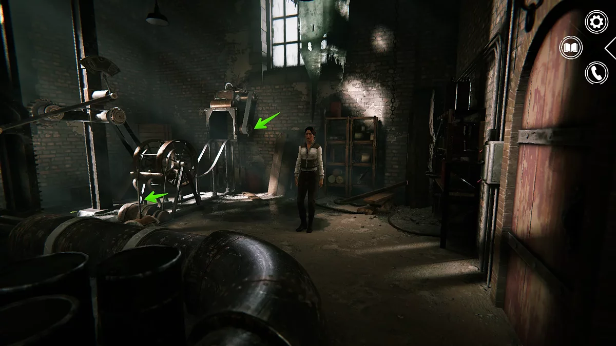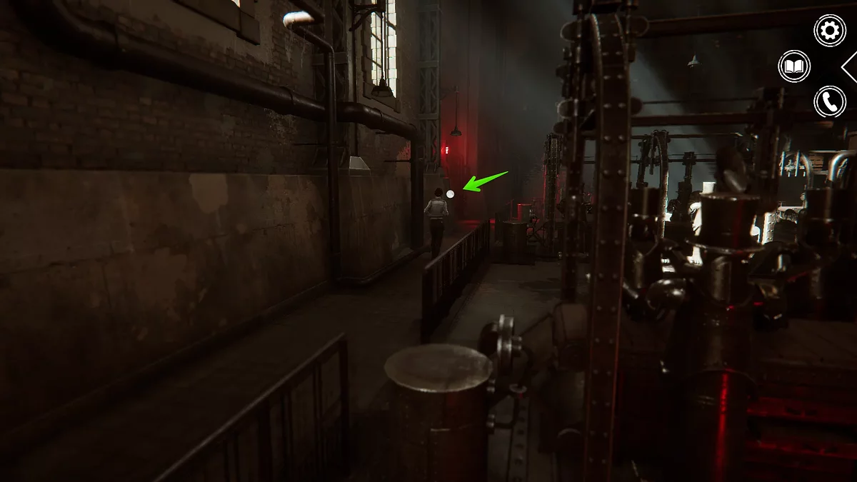 Выходите в сборочный цех и вернитесь к главной двери. Справа можно пройти к двери с красной лампочкой, которая приведет к помещению с механизмом. Взаимодействуйте здесь с двумя рычагами и покиньте комнату.