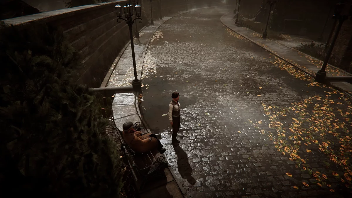 Покиньте отель и направляйтесь вправо по улице. В конце дороги вы увидите мужчину на скамье — поговорите с ним. Он поделится краткой информацией о недавних событиях в городе. После беседы возвращайтесь и идите в противоположную сторону. По пути можно пообщаться с пекарем у своей лавки — он скажет, что сегодня магазин закрыт, так как весь город в трауре по Анне Форальберг.