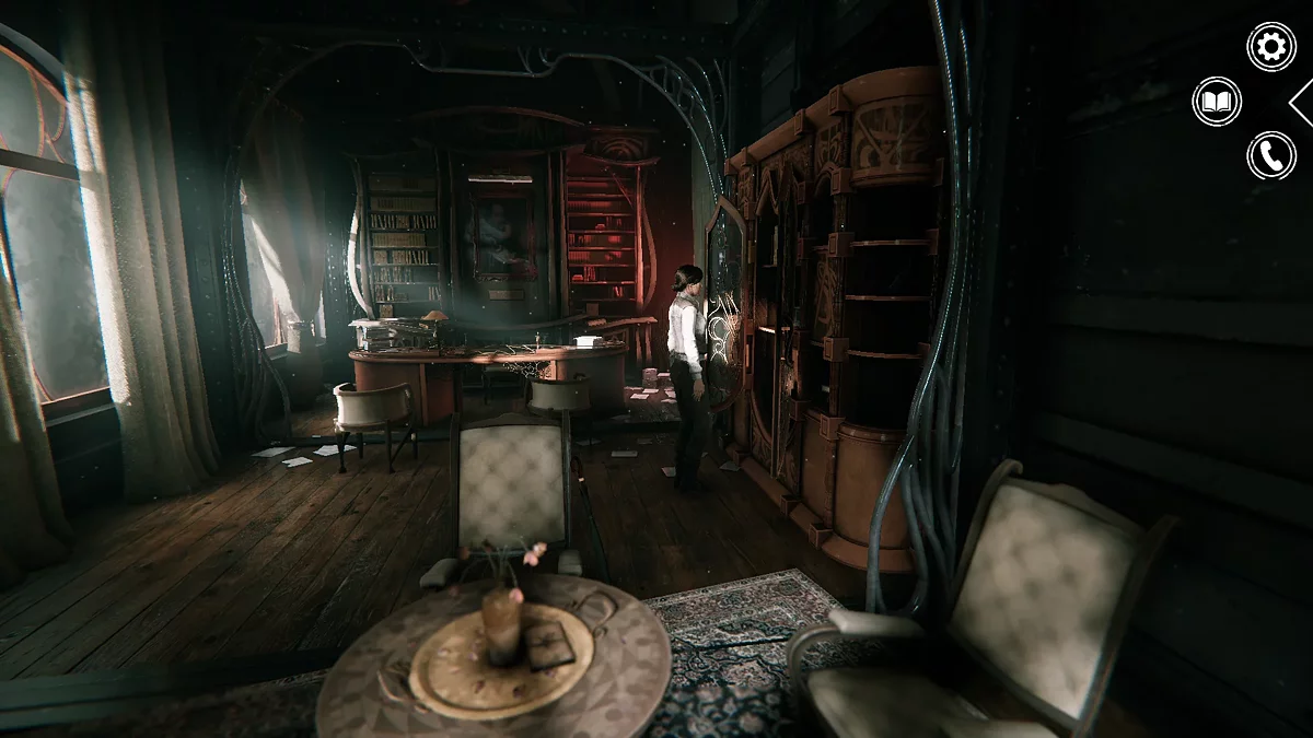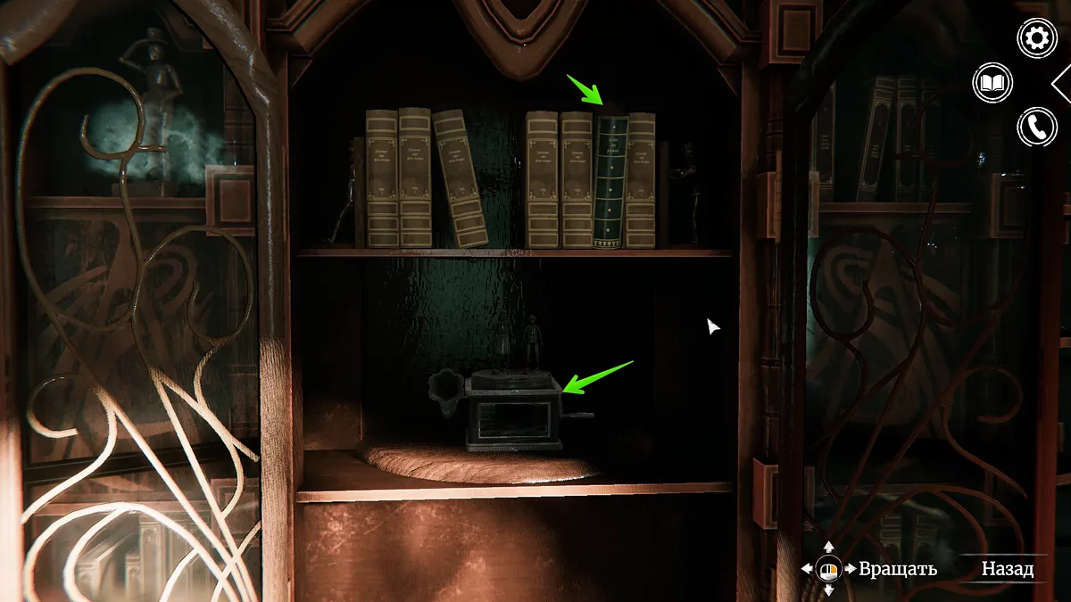 Теперь вернитесь назад и пройдите к тропе (1), ведущей к зданию фабрики. Войдите внутрь и поднимитесь по лестнице на второй этаж. В кабинете можно прочесть заметки Анны Форальберг, найти долговые счета и чертеж поезда. Здесь же есть потайное отделение в шкафу, но сейчас, скорее всего, оно не будет интерактивным. Сперва вам нужно проникнуть на чердак в дом Анны и прочесть дневник, в котором это указано. Однако если у вас появился маркер исследования шкафа, потяните за книгу темно-зеленого цвета и заберите музыкальный валик из шкатулки.