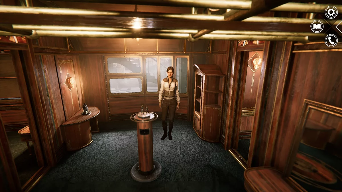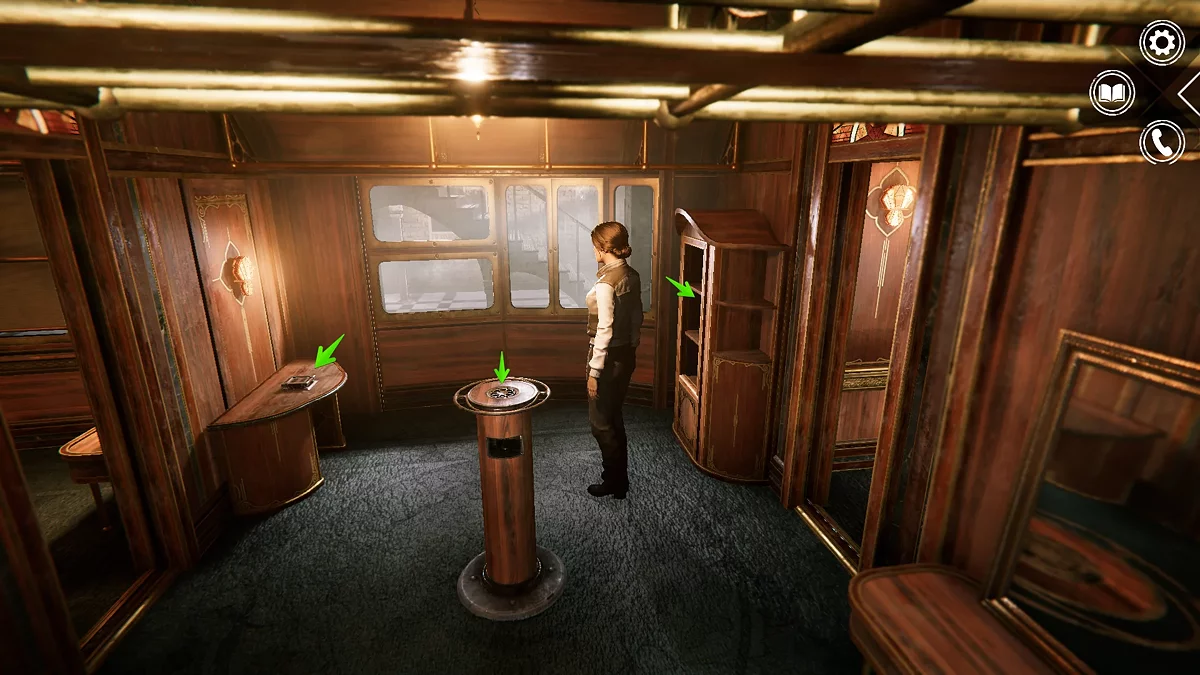 Теперь направляйтесь к железнодорожной станции и поднимитесь в поезд. Сначала можно не обращать внимания на Оскара, стоящего у выхода, а пройти чуть дальше по вагону. Осмотрите помещение и расставьте предметы: слева находится стойка для игрушечного мамонта, по центру — подставка для фигурок Ганса и Анны, а справа — шкаф для музыкальных валиков. Делать это необязательно прямо сейчас, но так вы сэкономите немного времени.